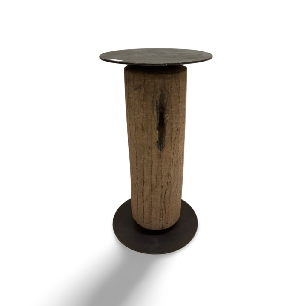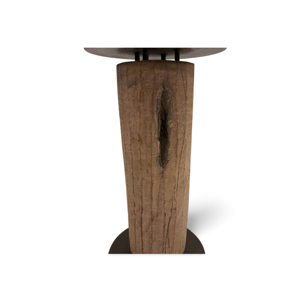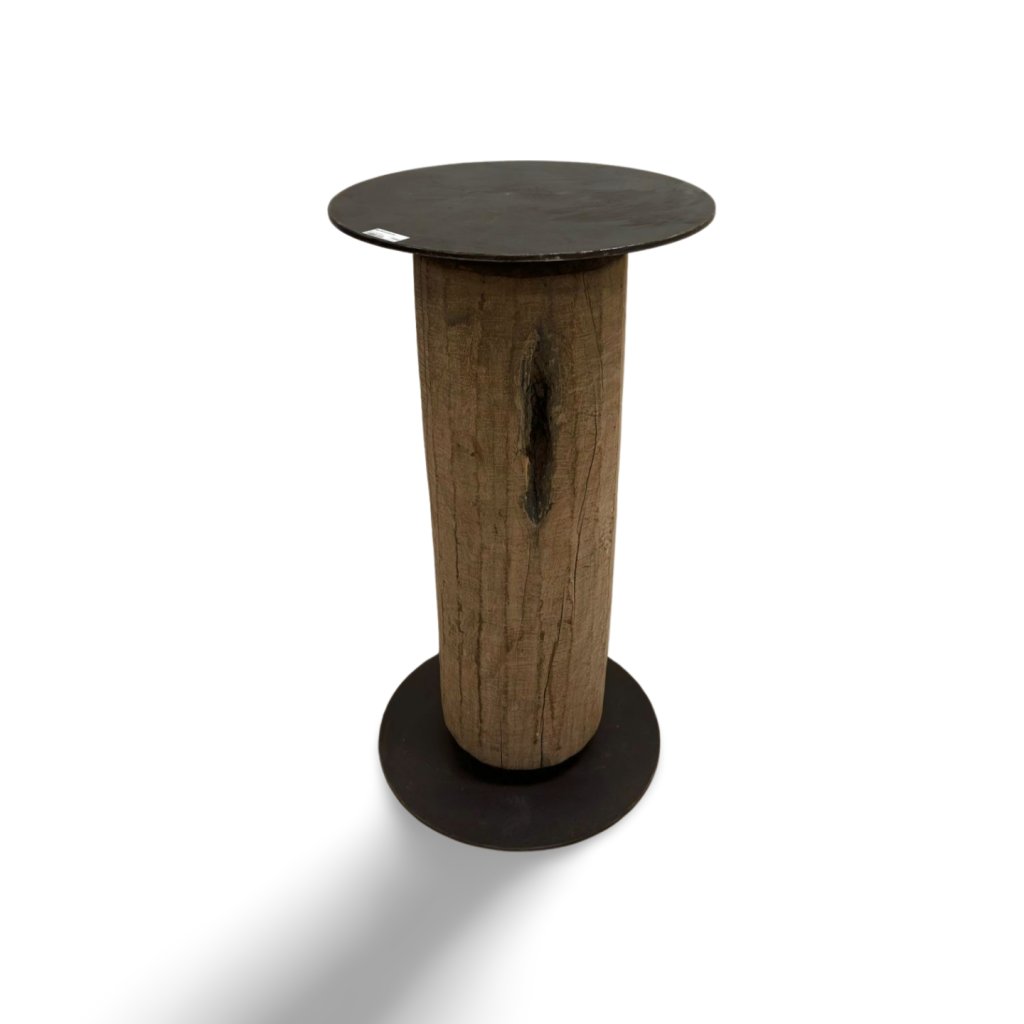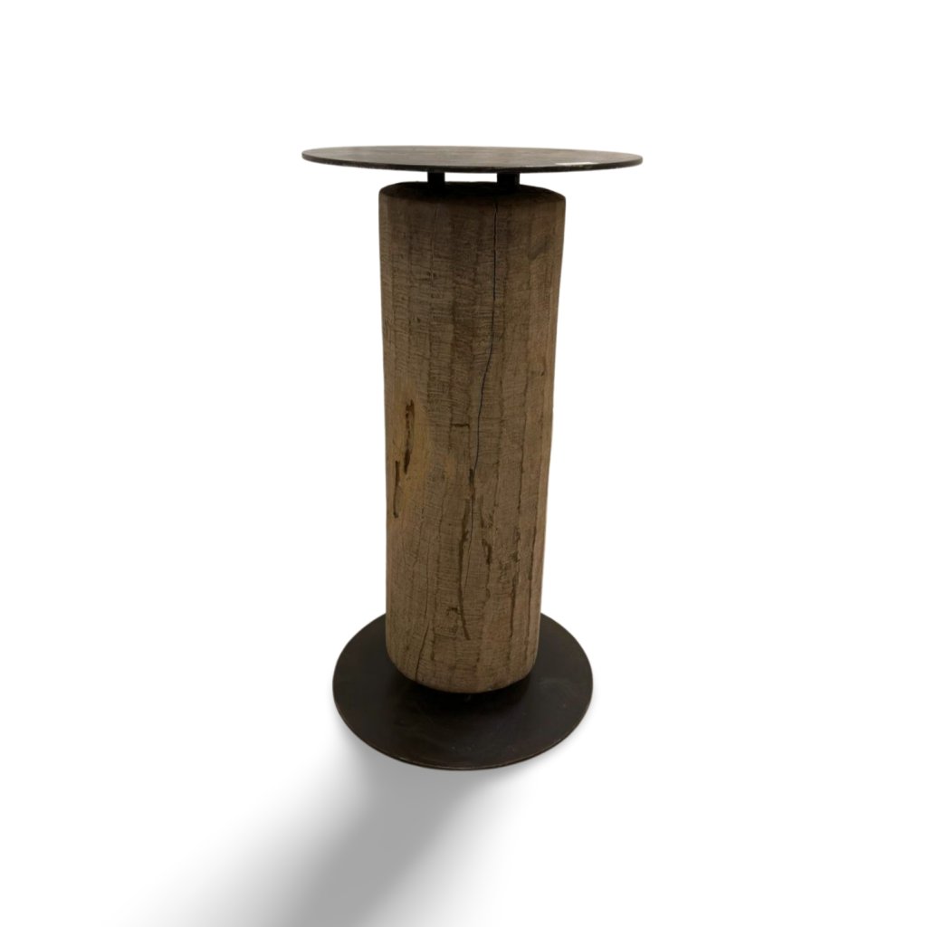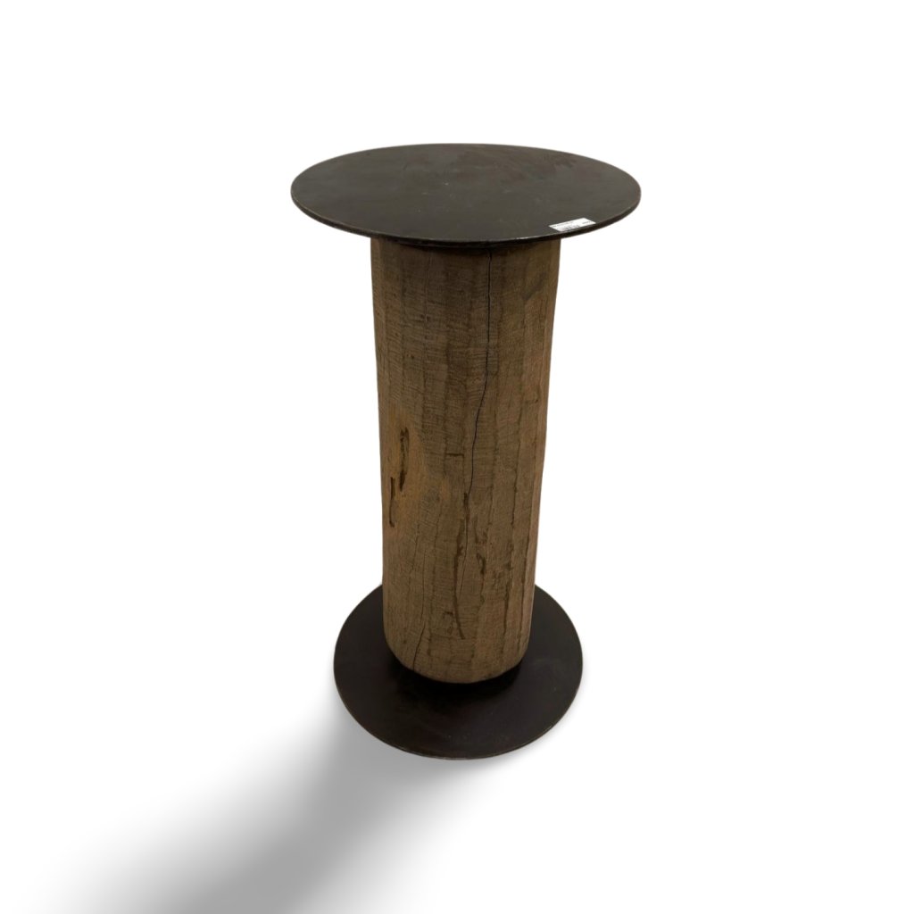Masivní barový stolek z kmene dřeva s kovovou deskou