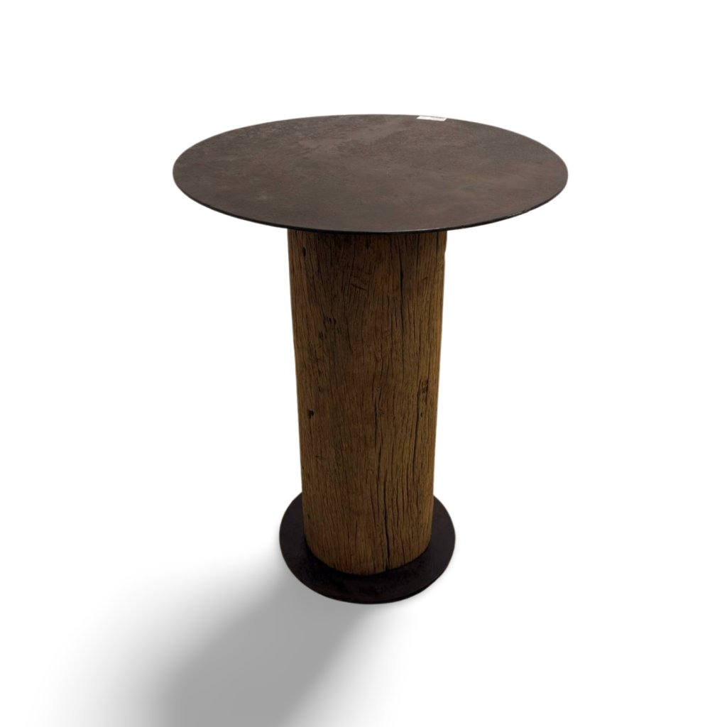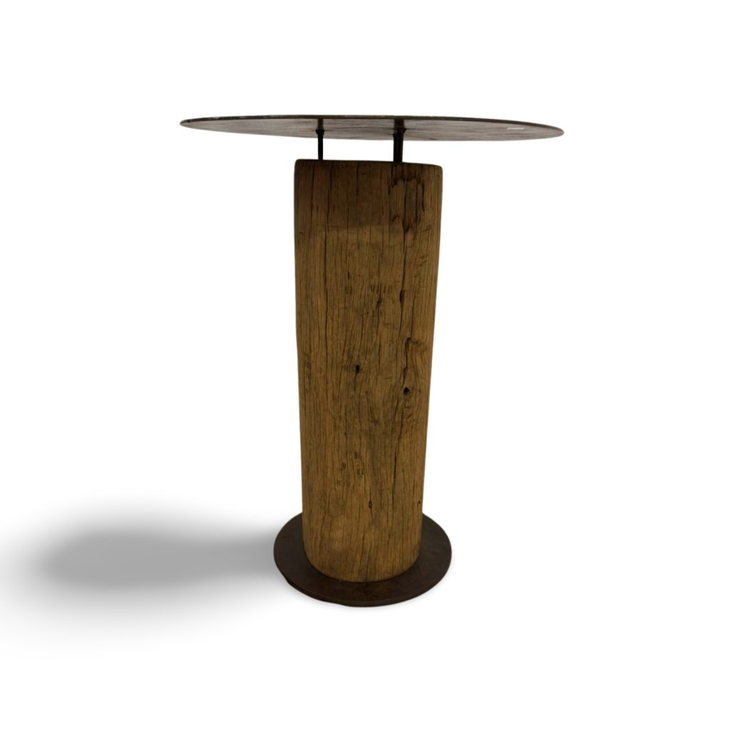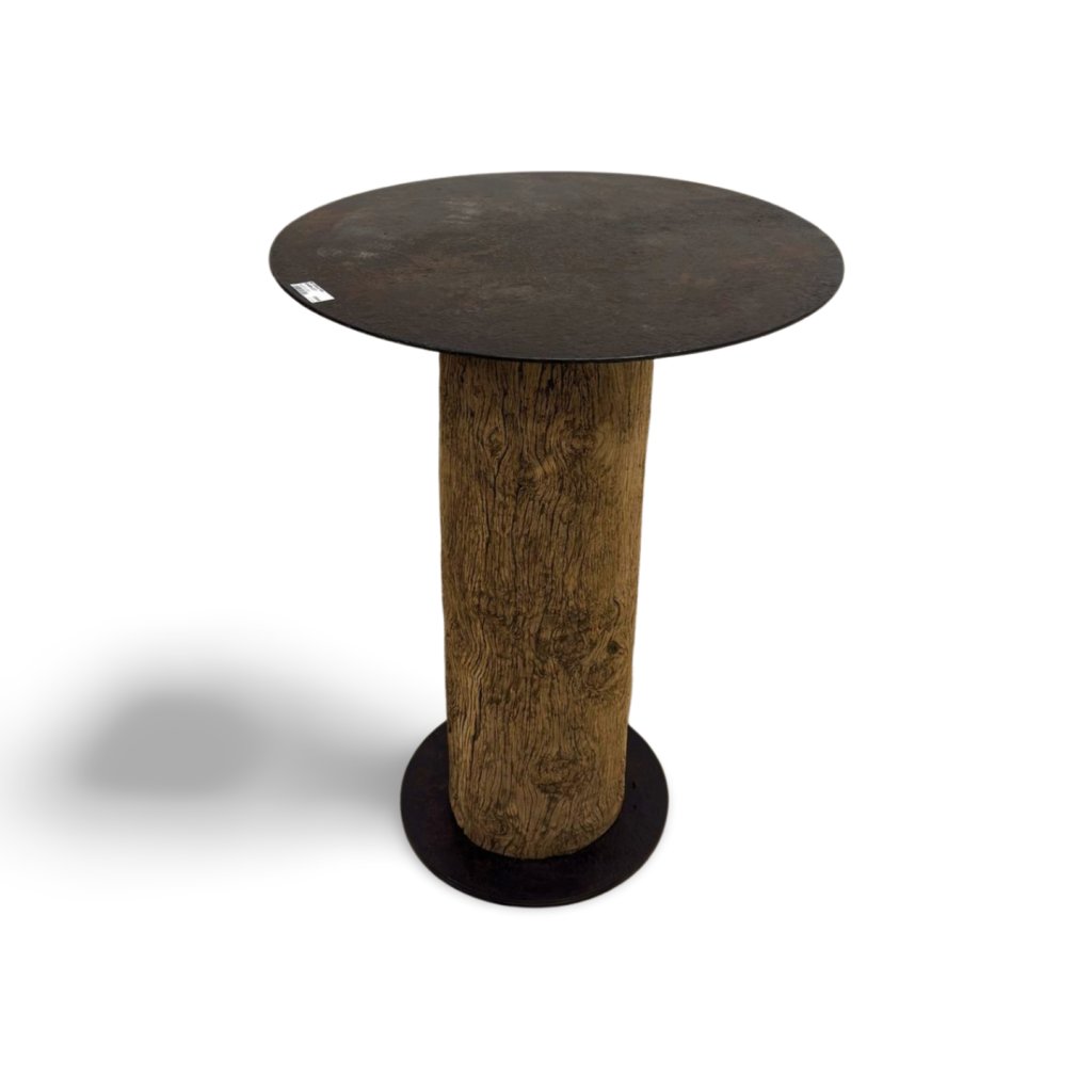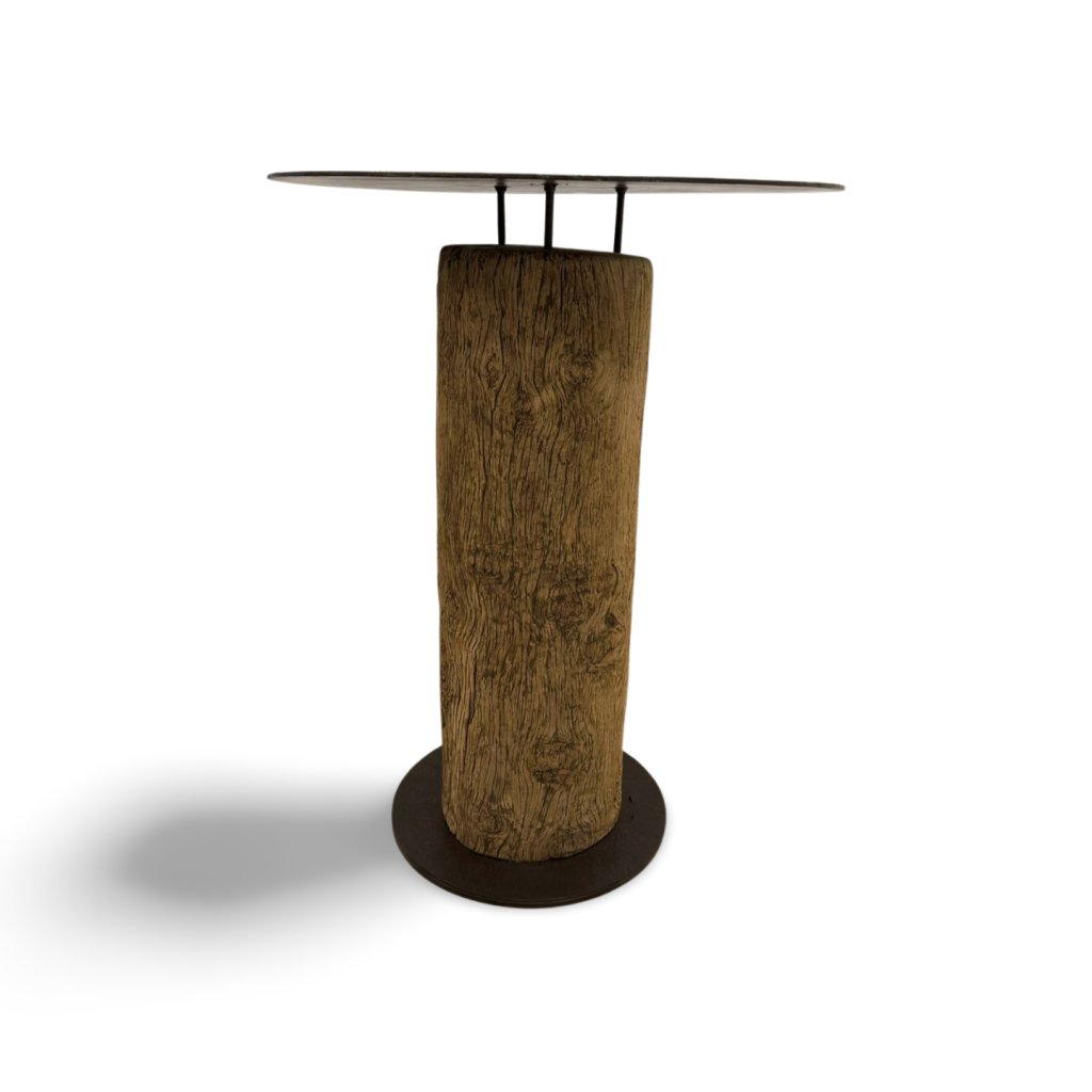 Originální barový stolek z masivního kmene dřeva s kovovou deskou