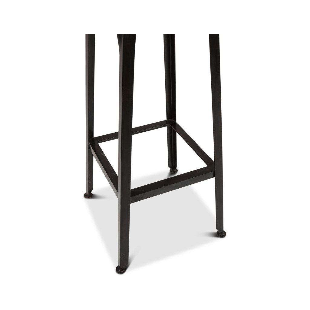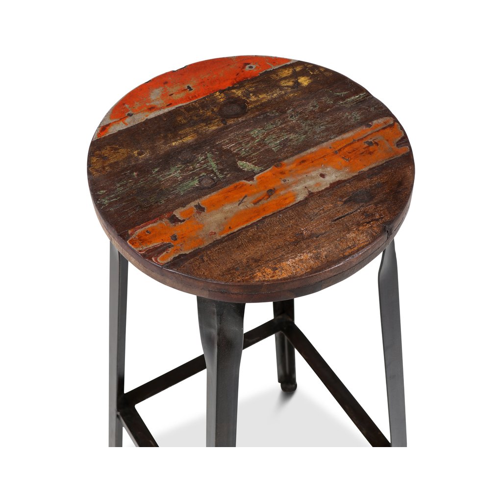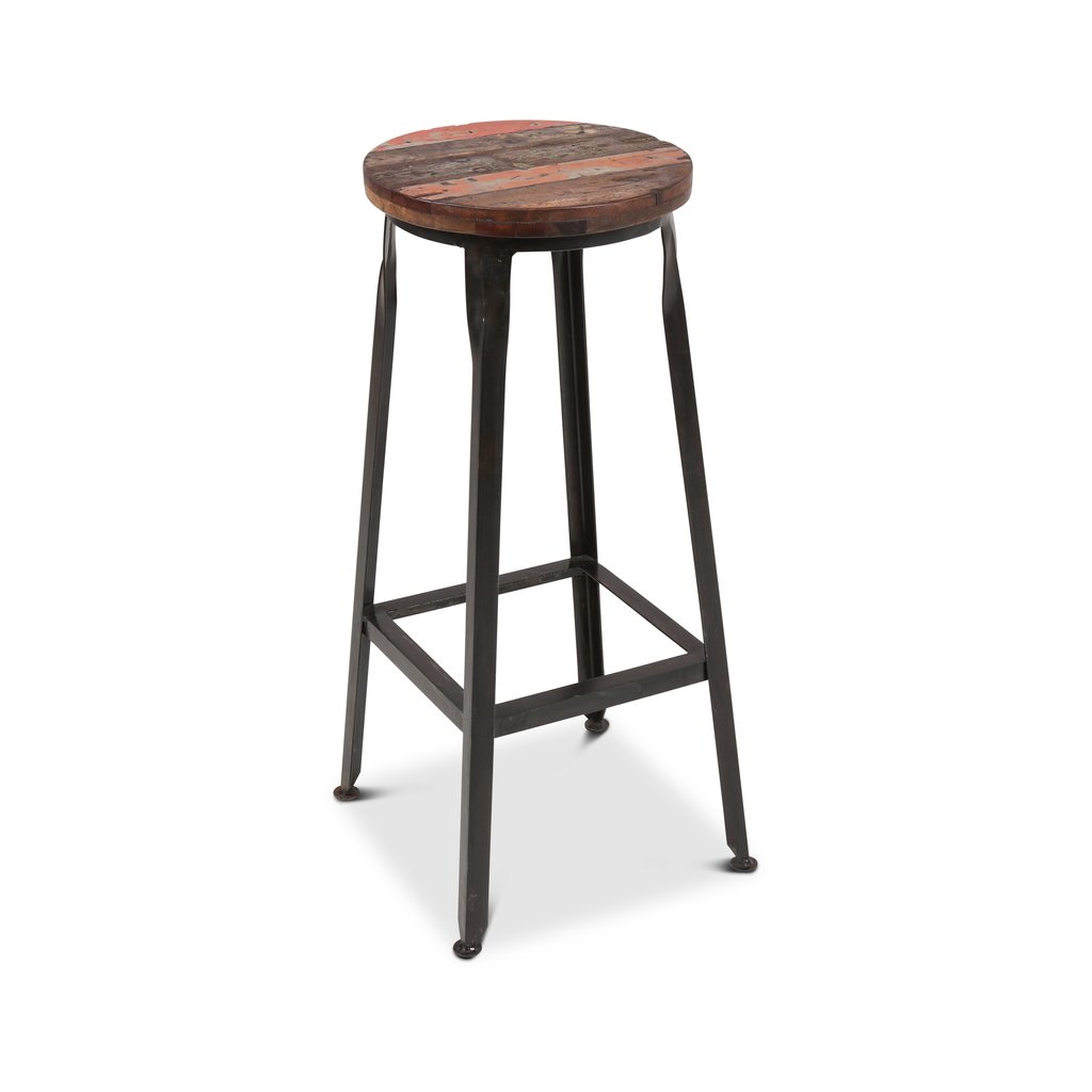 Tato barová stolička spojuje poctivé řemeslo, industriální vzhled a příběh materiálu. Sedák je vyroben z recyklovaného dřeva sheesham, které vyniká výraznou kresbou, barevnými přechody a přirozenou patinou. Díky použití recyklovaného dřeva je každý kus originál – žádné dvě stoličky nejsou stejné.