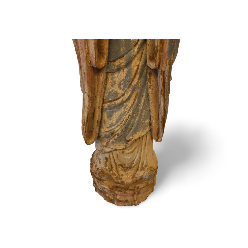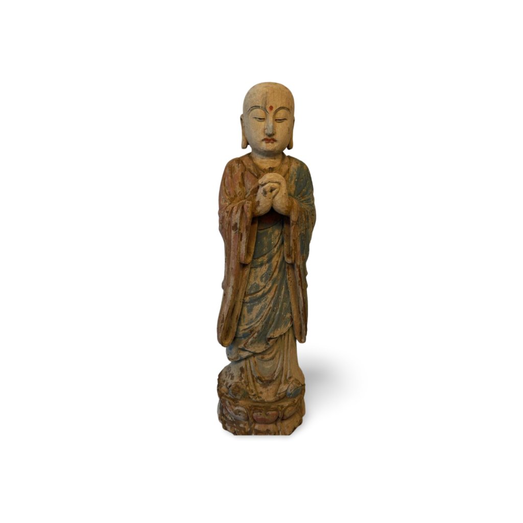 Tato dřevěná socha Buddhy pochází z Číny a zaujme především svým klidným, vyrovnaným výrazem a přirozenou patinou, která podtrhuje její stáří a charakter. Jemně tvarované rysy obličeje a detailně zpracovaný oděv dodávají soše harmonický a nadčasový vzhled.