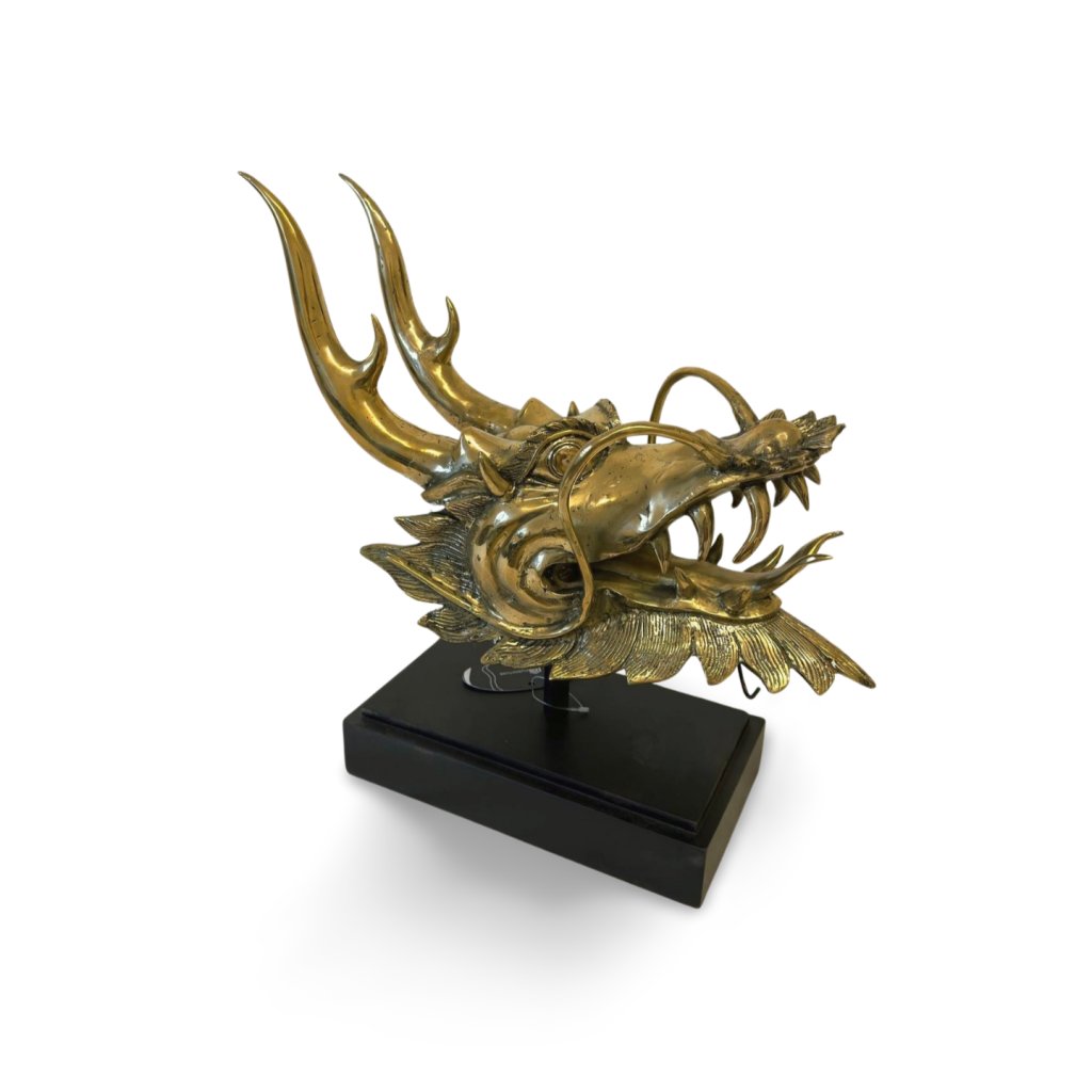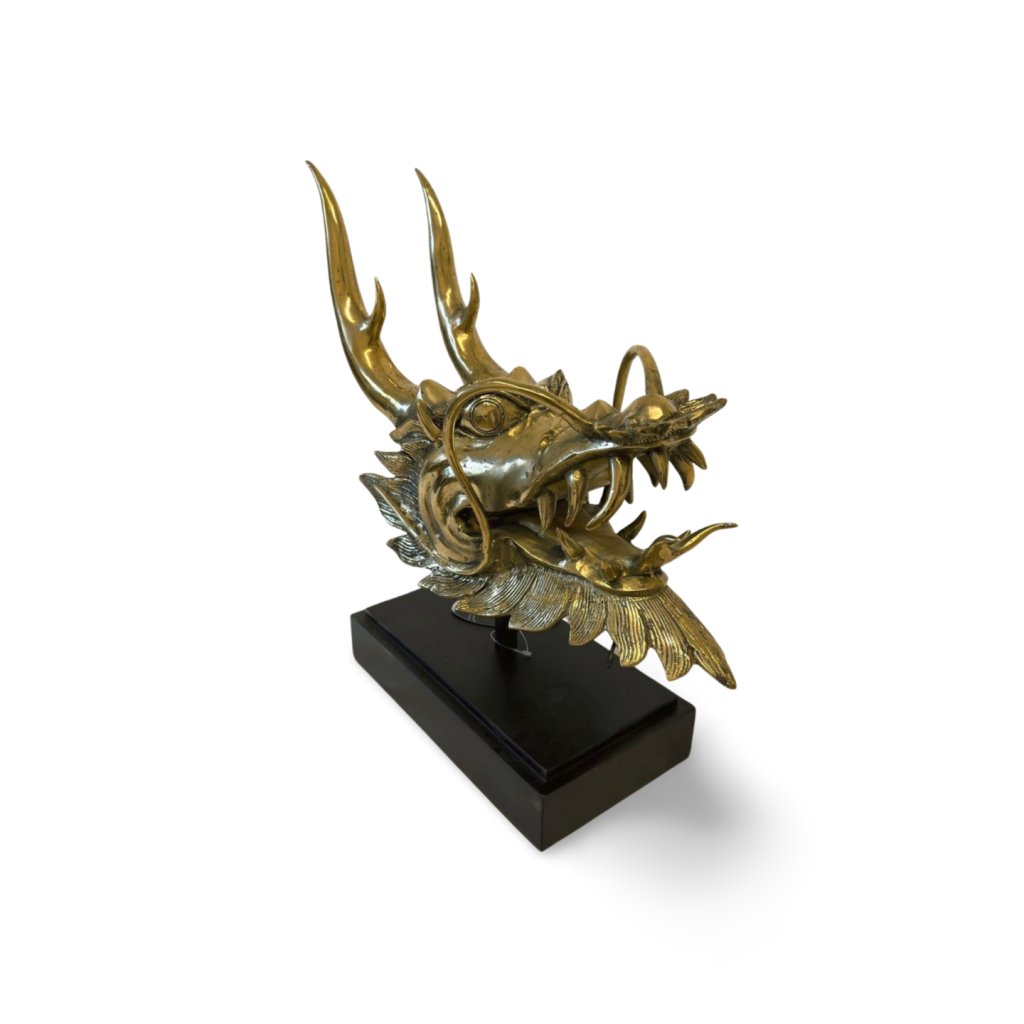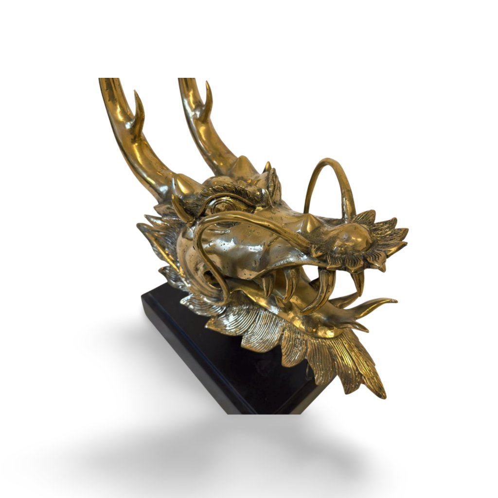 Kovová dekorace v podobě hlavy čínského draka představuje silný symbol moci, ochrany a prosperity. Detailně zpracovaná plastika zachycuje typické rysy tradičního draka – výrazné rohy, otevřenou tlamu, ostré zuby i charakteristické vousy.