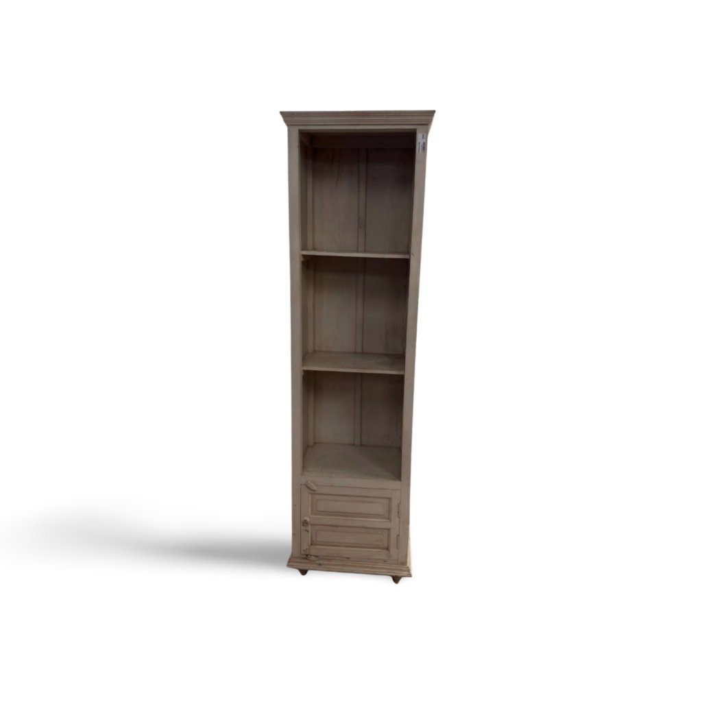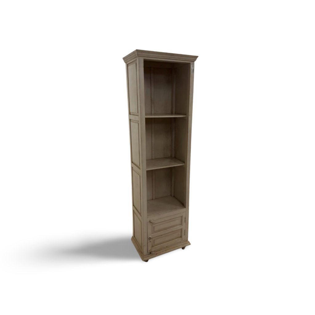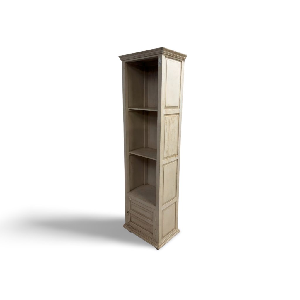 Tato bílá knihovna z masivu kombinuje jednoduché linie, jemné profilování a lehce patinovaný povrch, který nábytku dodává přirozený charakter.