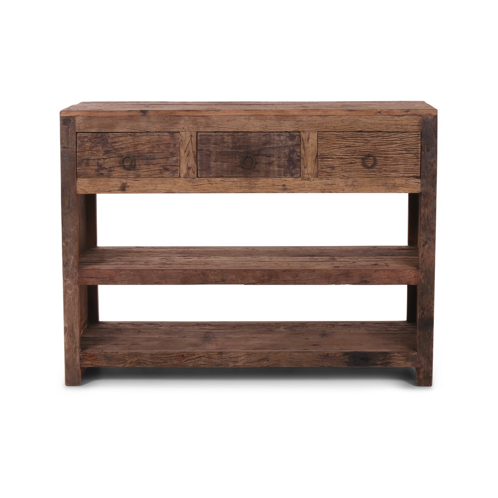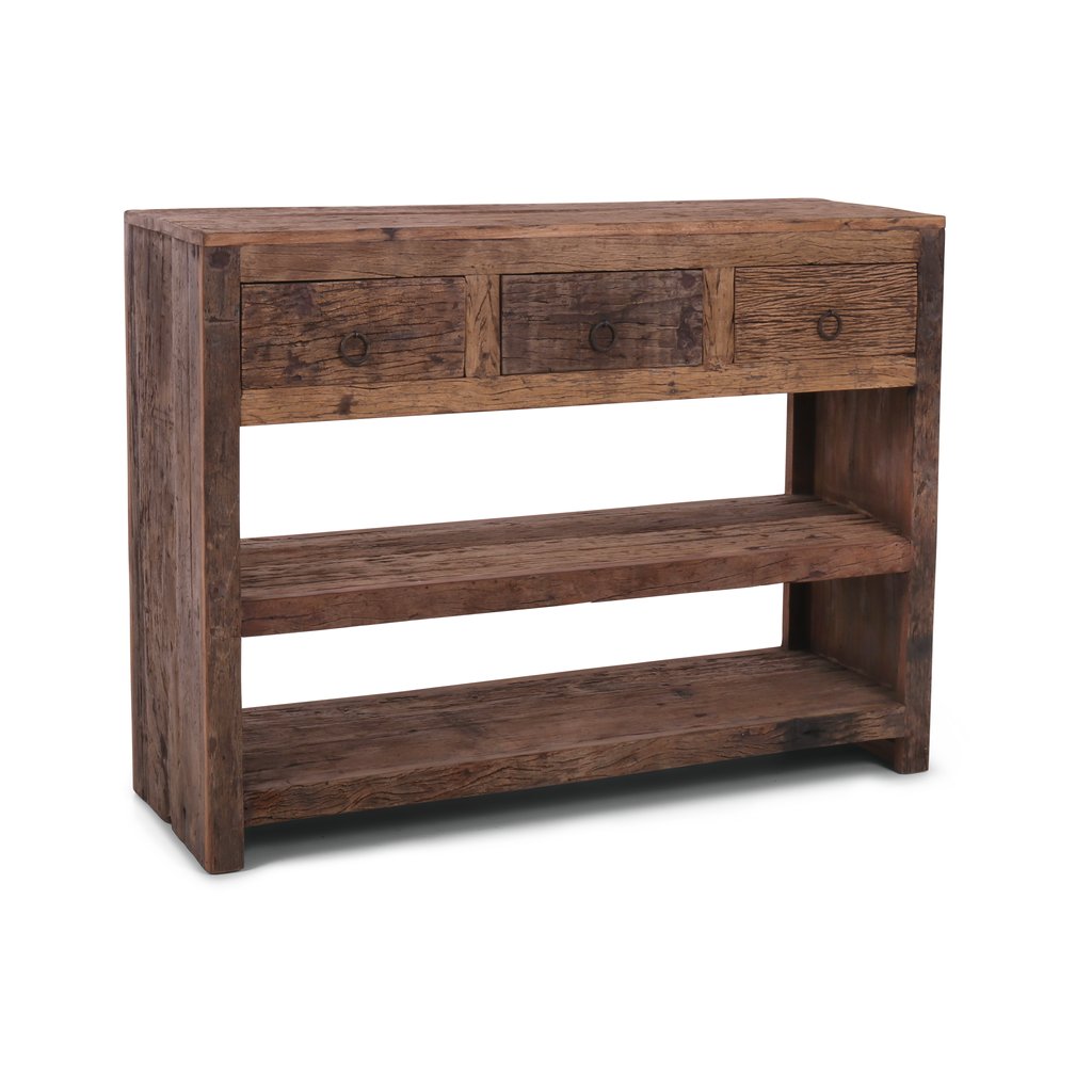 Tento elegantní konzolový stolek z indického jilmu kombinuje krásu přírodního dřeva a funkčnost. S třemi prostornými zásuvkami nabízí dostatek úložného prostoru pro drobnosti a osobní věci. Dřevo jilmu je známé svou pevností a krásnou texturou, která dodává nábytku jedinečný charakter. Jeho design s jednoduchými liniemi a detaily v podobě jemných řezeb v kombinaci s přirozenou patinou vytváří stylový prvek, který se hodí do různých interiérů, od tradičních po moderní.