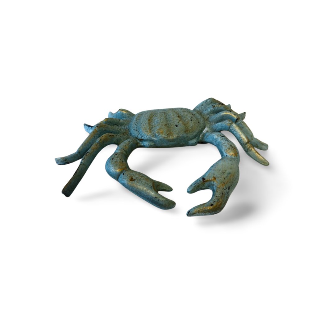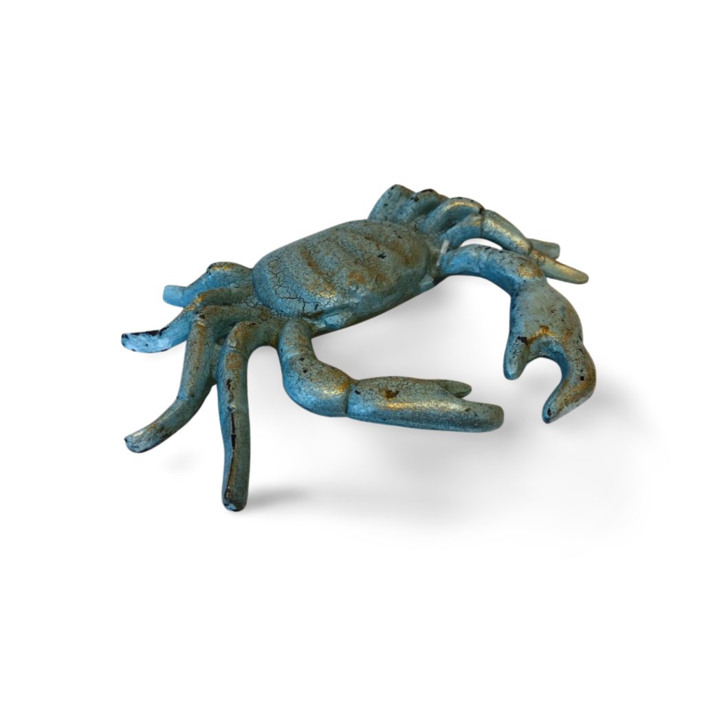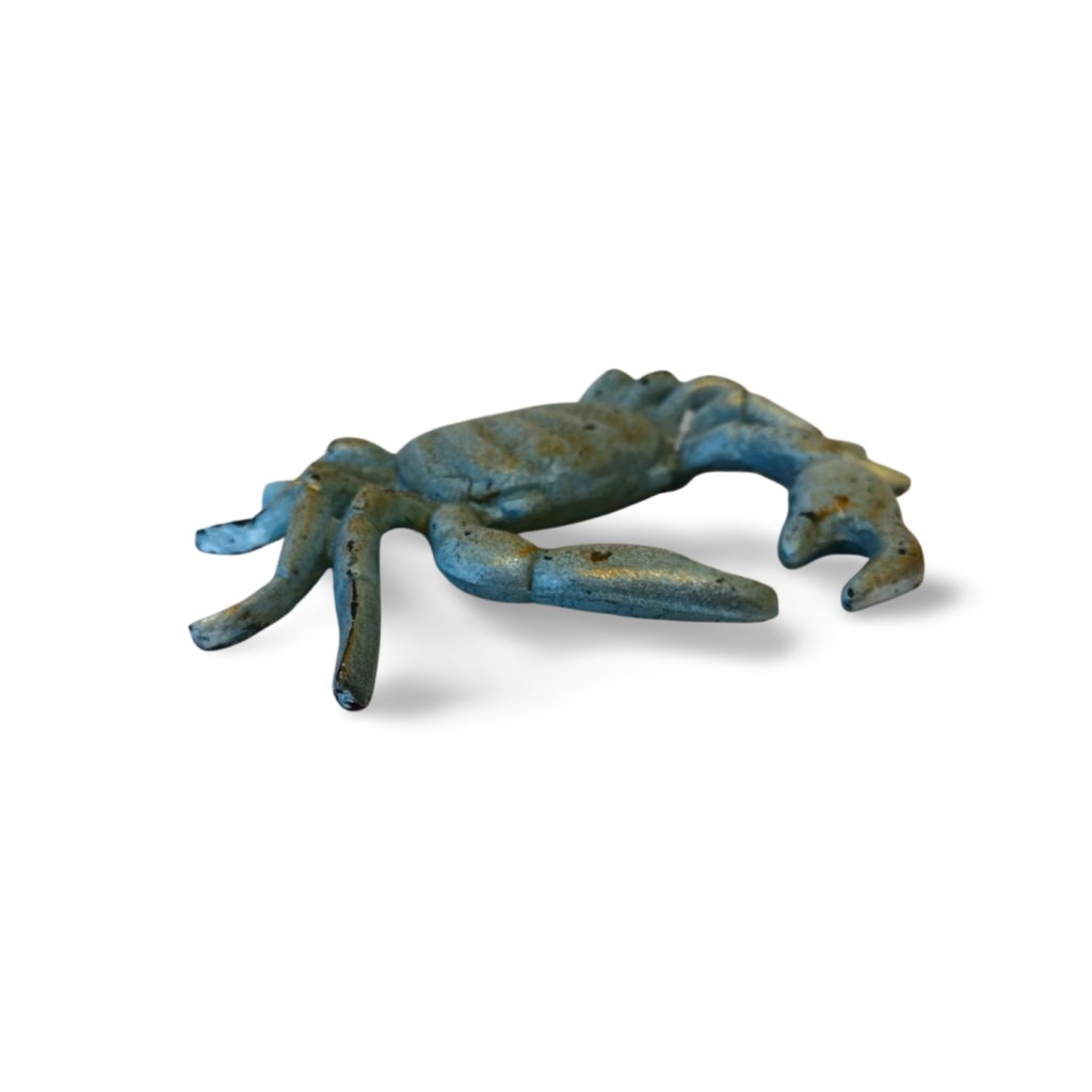 Tato originální kovová dekorace ve tvaru kraba zaujme výraznou modro-zlatou patinou, která vytváří zajímavý kontrast a hloubku povrchu. Jemně popraskaný efekt a nepravidelné odstíny dodávají objektu autentický charakter a lehce industriální nádech.