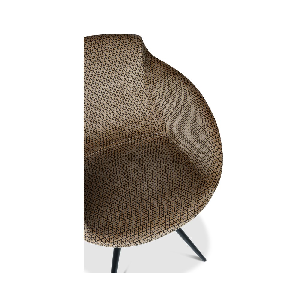 Ergonomicky tvarovaná skořepina poskytuje komfortní oporu zad i paží a zve k pohodlnému posezení. Sametové čalounění dodává křeslu měkkost a vizuální hloubku, zatímco kovová podnož v tmavém provedení zajišťuje stabilitu a moderní kontrast k teplému tónu látky.
