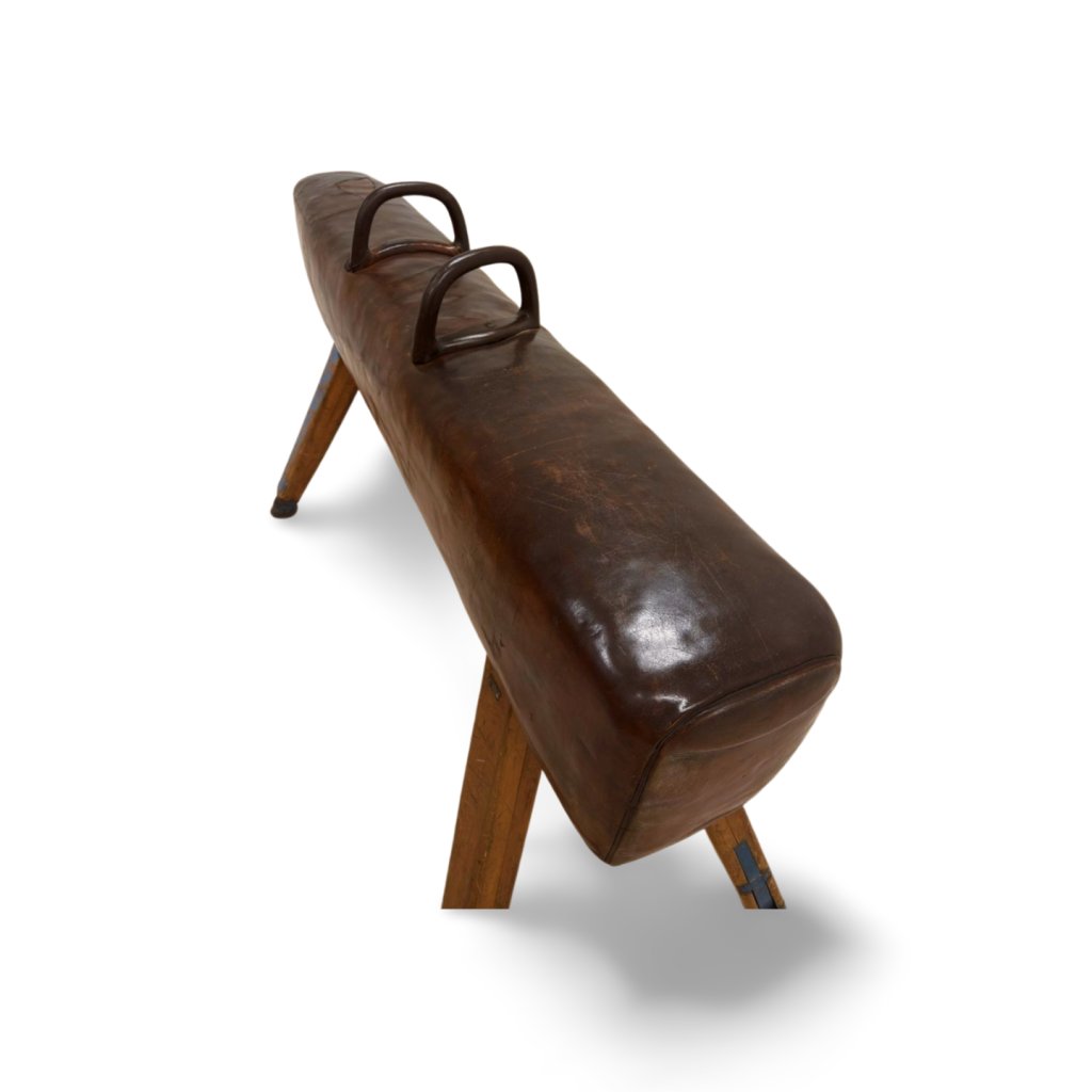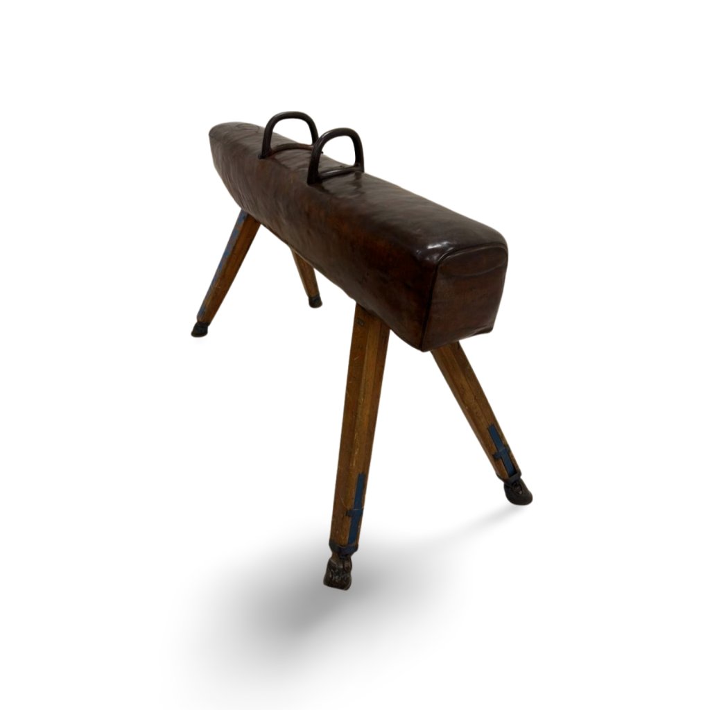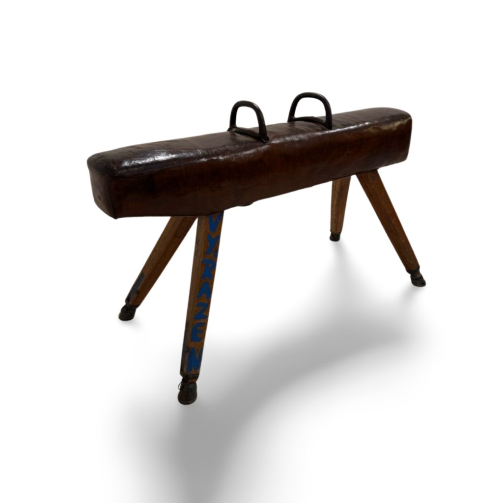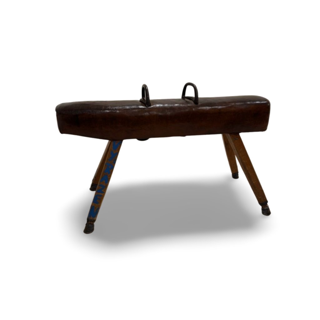Originální gymnastický kůň pochází z České republiky a byl součástí vybavení školních tělocvičen. Dnes představuje výrazný vintage kus s autentickou patinou a jedinečným charakterem.