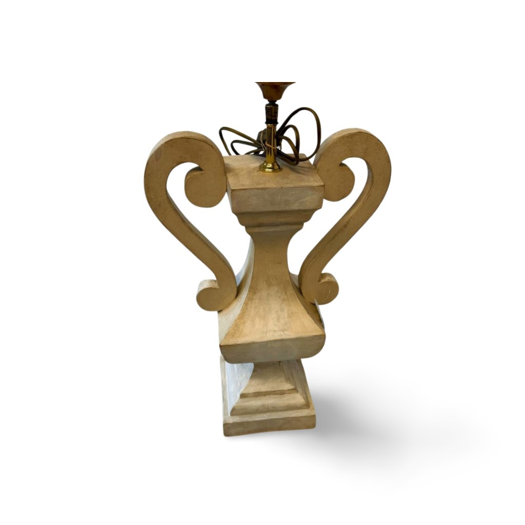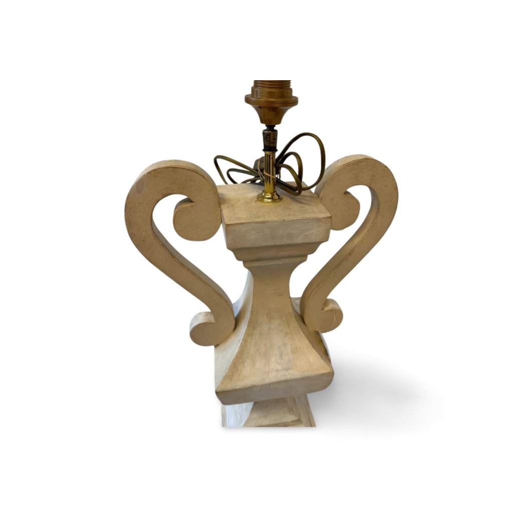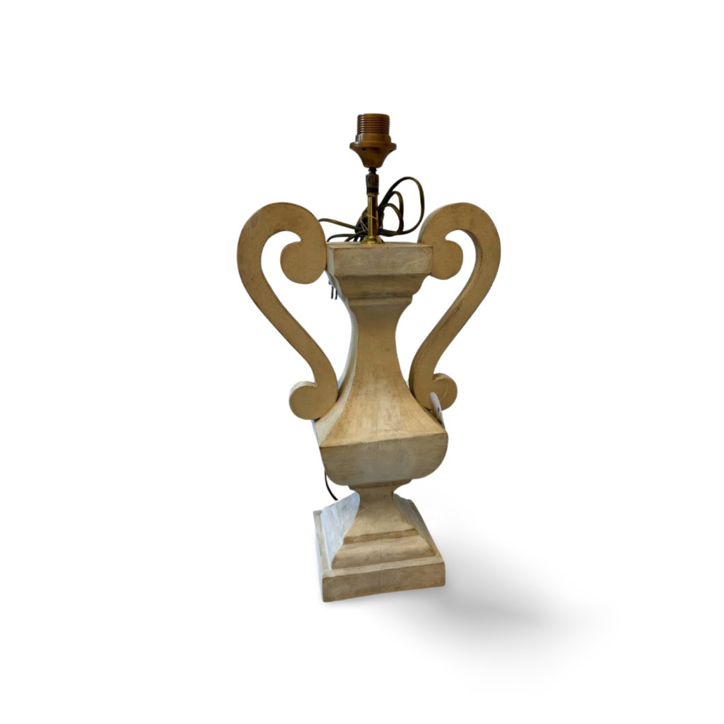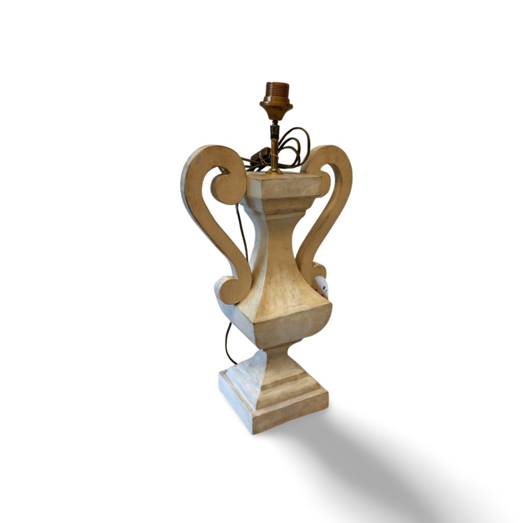 Tato dřevěná stolní lampa zaujme svým sochařským tvarem inspirovaným tradičními amforami. Výrazné boční křivky a jemná bílá patina dodávají lampě elegantní a nadčasový charakter.