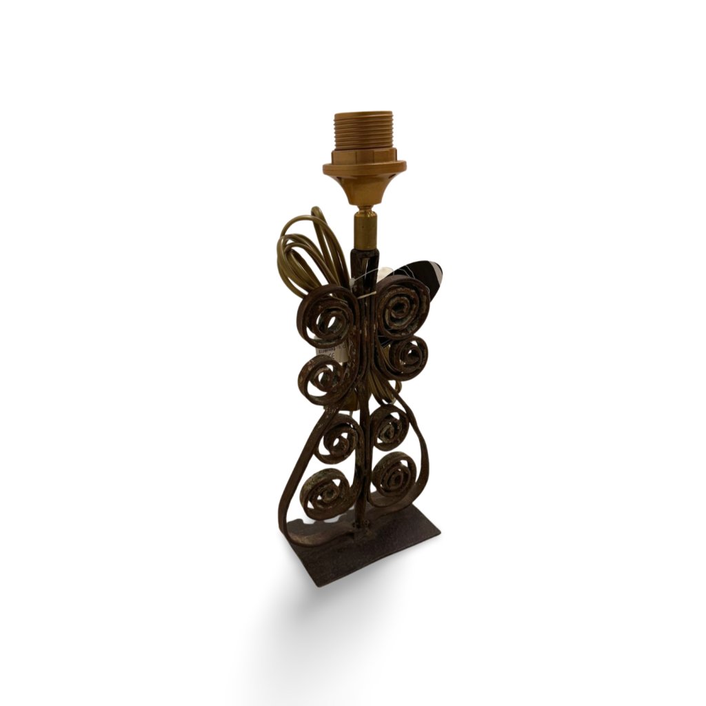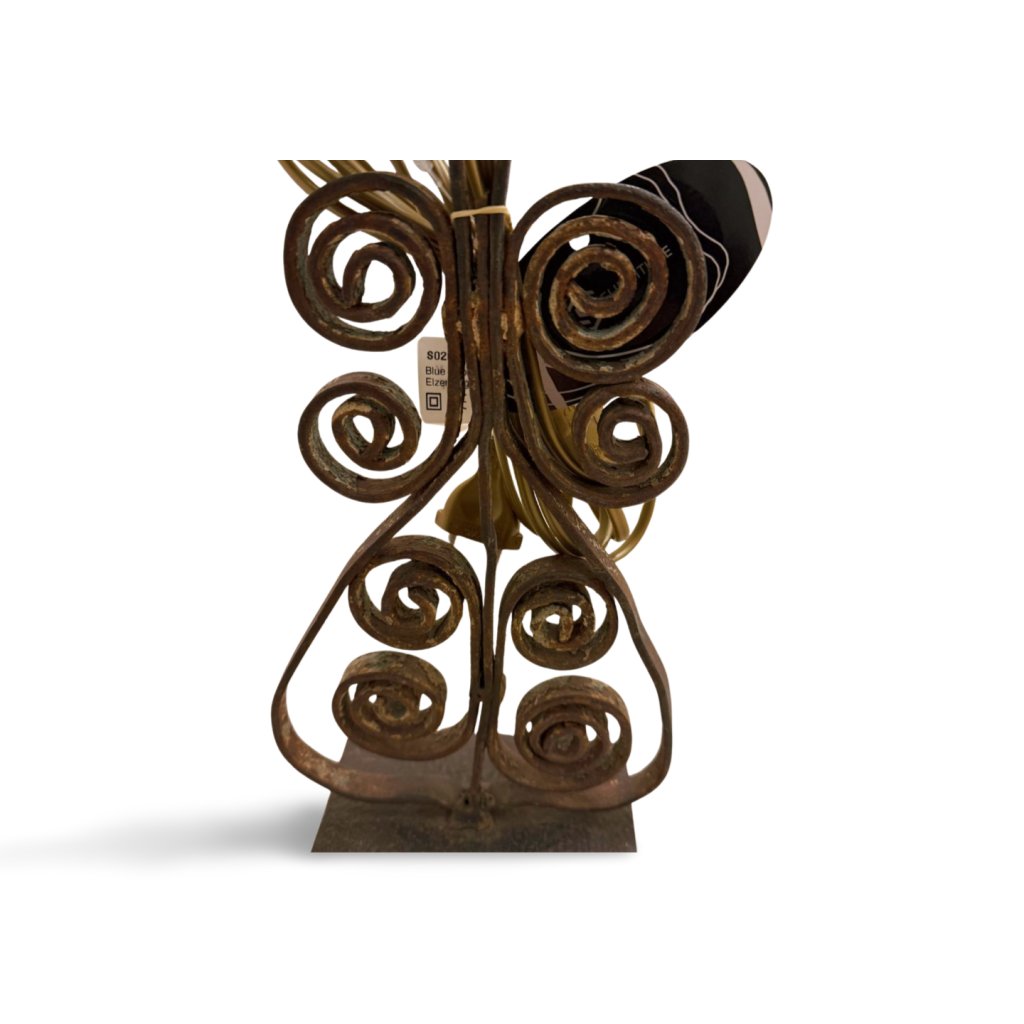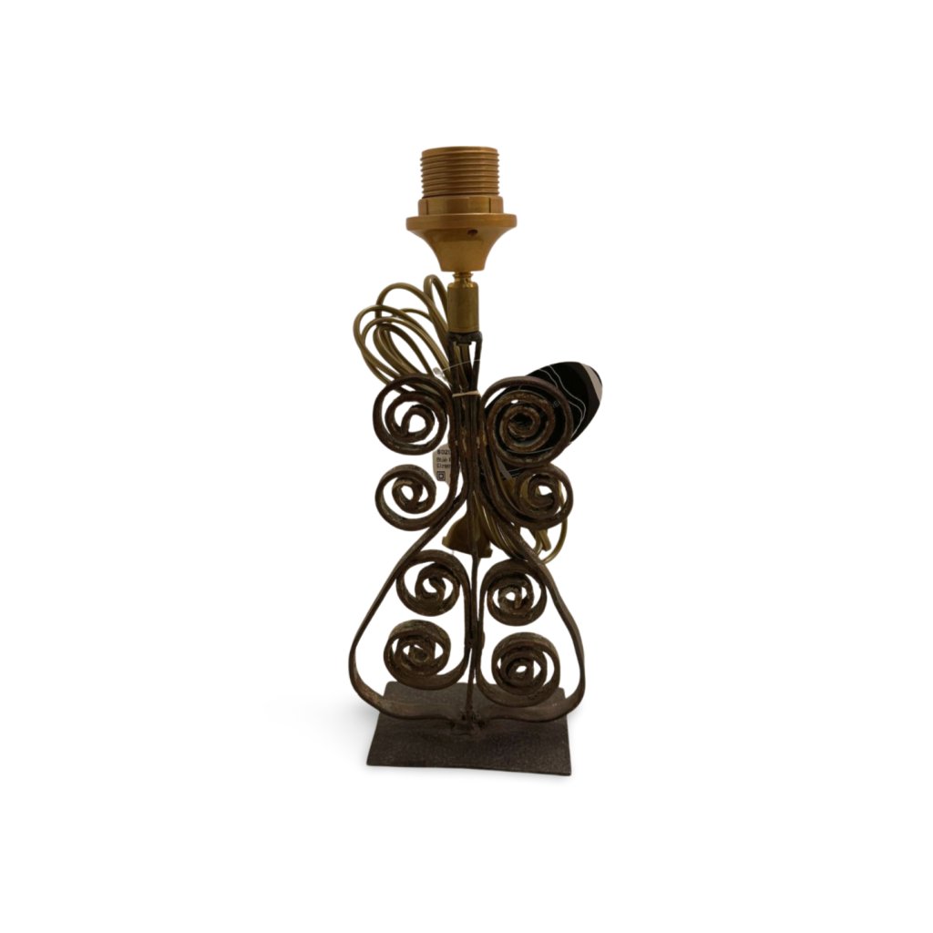 Stolní lampa Jalli je originální dekorativní svítidlo z kovu, které zaujme svým ručně tvarovaným designem s ornamentálními křivkami. Spirálové prvky a patinovaný povrch dodávají lampě lehce industriální, ale zároveň řemeslný charakter, díky kterému se stane nepřehlédnutelným doplňkem interiéru.