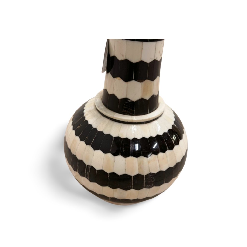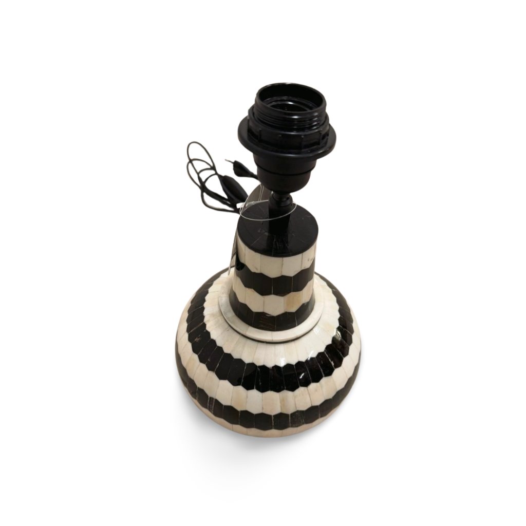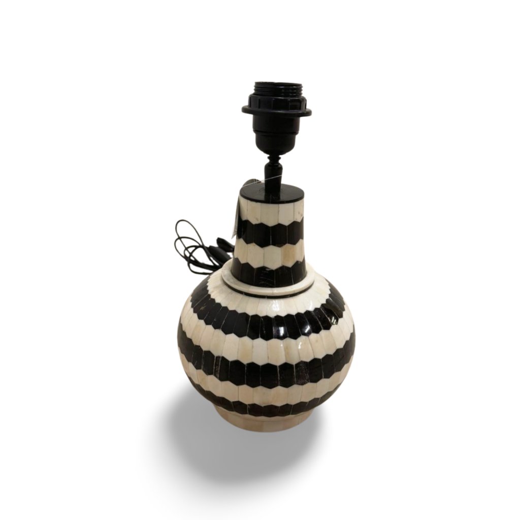 Tato stolní lampa z kosti je výjimečným designovým doplňkem, který kombinuje tradiční ruční řemeslo s výrazným geometrickým vzorem. Povrch lampy je tvořen precizně skládanými kostěnými segmenty v kontrastním černo-bílém provedení, které vytvářejí elegantní a zároveň nepřehlédnutelný efekt.