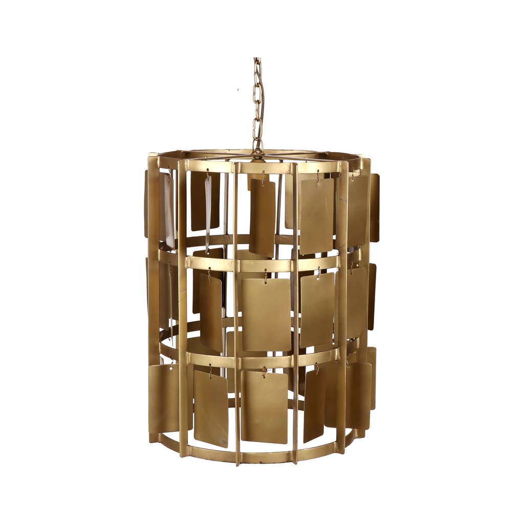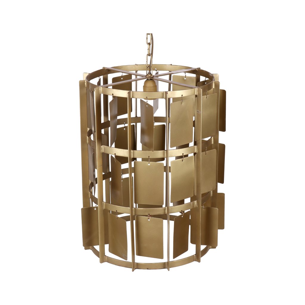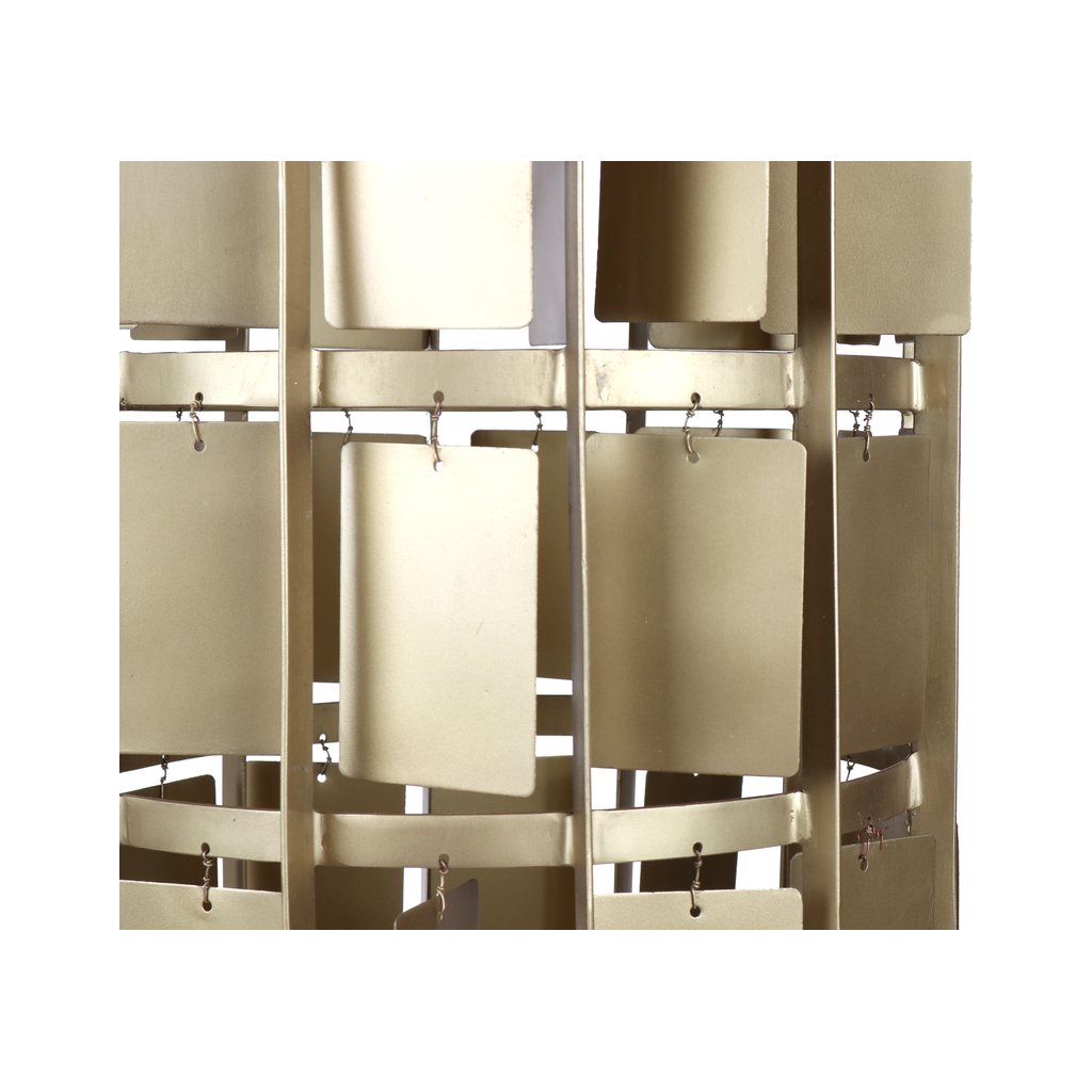 Závěsná lampa Satna L je výrazným designovým solitérem, který okamžitě přitáhne pozornost. Kovová konstrukce v teplém mosazném (brass) odstínu je tvořena jednotlivými zavěšenými plátky, které vytvářejí dynamickou hru světla, stínu a odlesků.