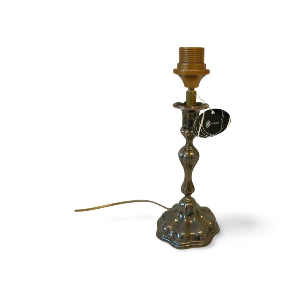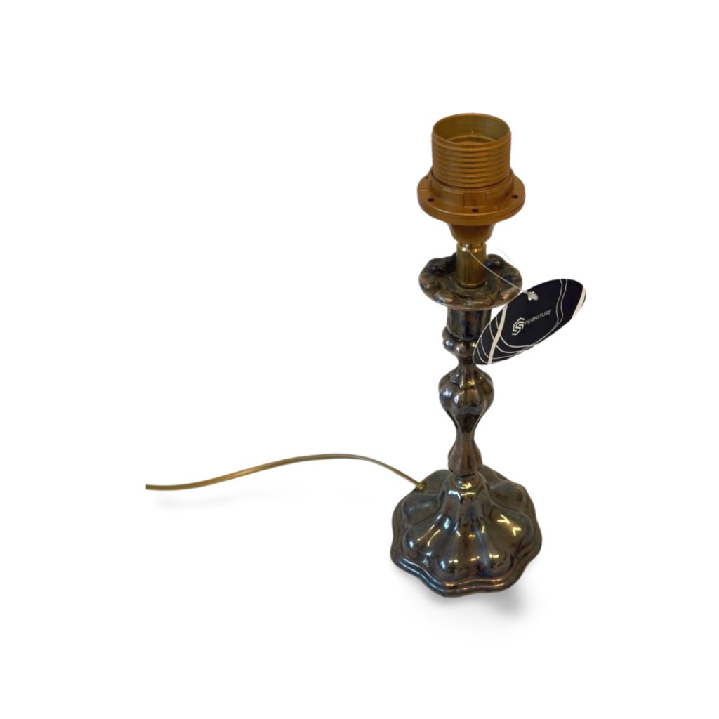Tato kovová lampička představuje starší dekorativní kus s elegantním, tradičním tvarem a výraznou patinou, která podtrhuje její stáří a charakter. Profilovaná noha a plasticky tvarovaná základna odkazují na klasické pojetí osvětlení, kdy lampa nebyla jen funkčním prvkem, ale i estetickým objektem.