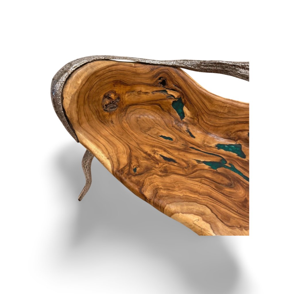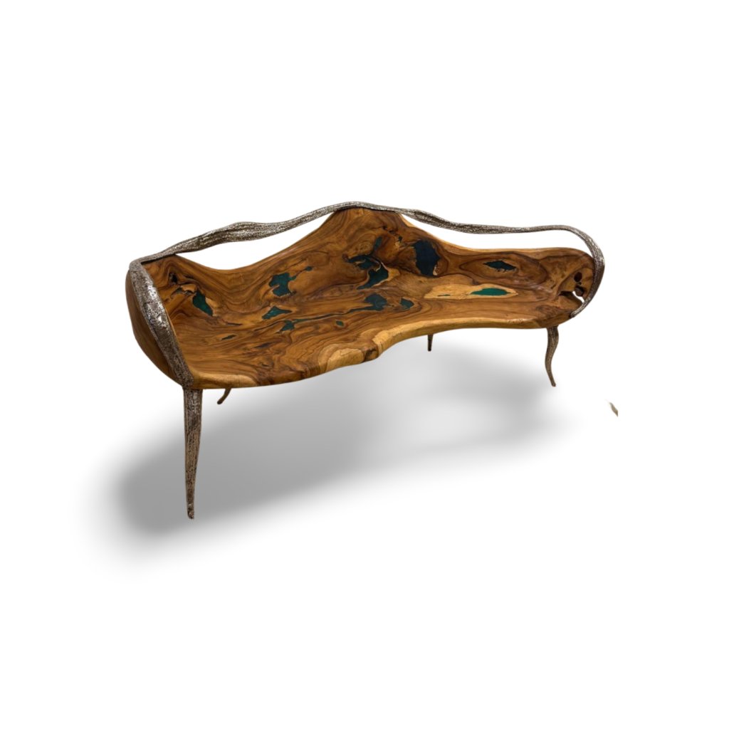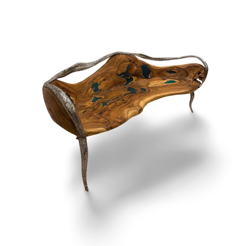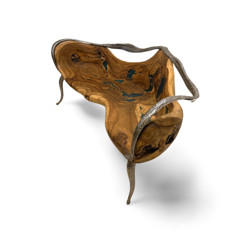 Konstrukci doplňuje ručně tvarovaný kovový rám ve stříbrném provedení, pravděpodobně z tepaného kovu. Organické linie kovových prvků navazují na přirozený tvar dřeva a podtrhují sochařský charakter celé lavice. Spojení přírodního dřeva, pryskyřice a kovu vytváří silný, jedinečný celek.