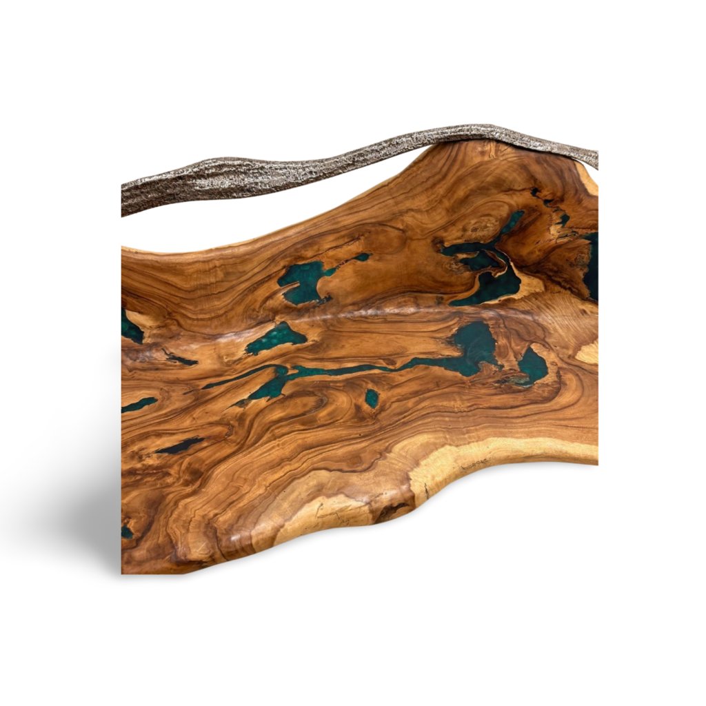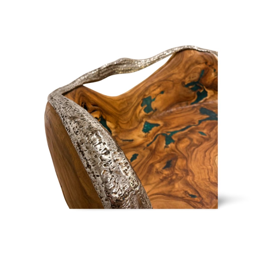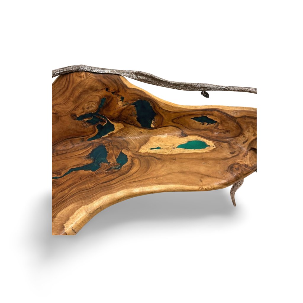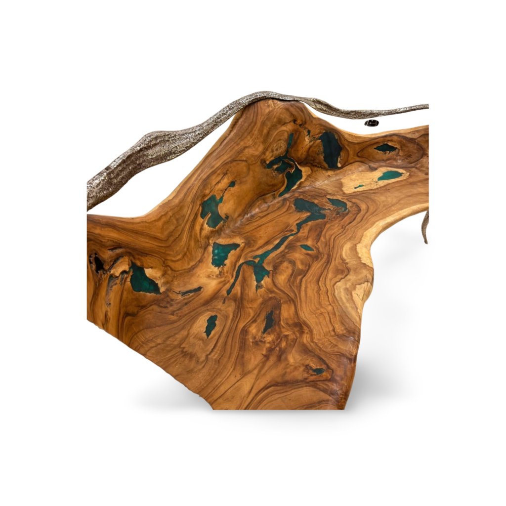 Konstrukci doplňuje ručně tvarovaný kovový rám ve stříbrném provedení, pravděpodobně z tepaného kovu. Organické linie kovových prvků navazují na přirozený tvar dřeva a podtrhují sochařský charakter celé lavice. Spojení přírodního dřeva, pryskyřice a kovu vytváří silný, jedinečný celek.