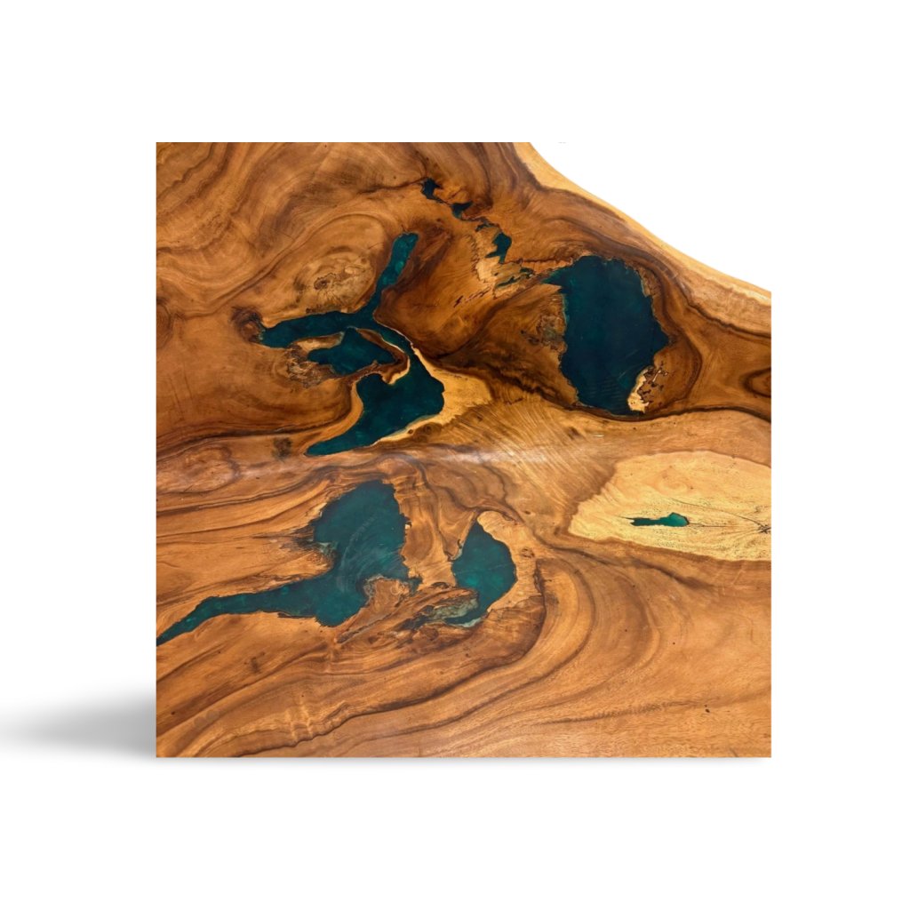 Teak je známý svou extrémní tvrdostí, odolností a dlouhou životností. V kombinaci s masivním provedením je lavice velmi těžká, stabilní a působí mimořádně robustním dojmem. Každý kus je originál – tvar desky, kresba dřeva i rozmístění pryskyřice nelze nikdy přesně zopakovat.