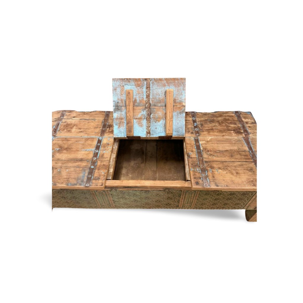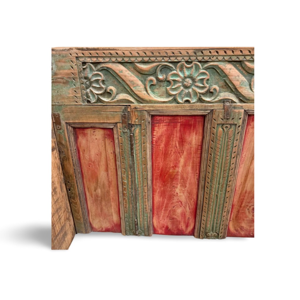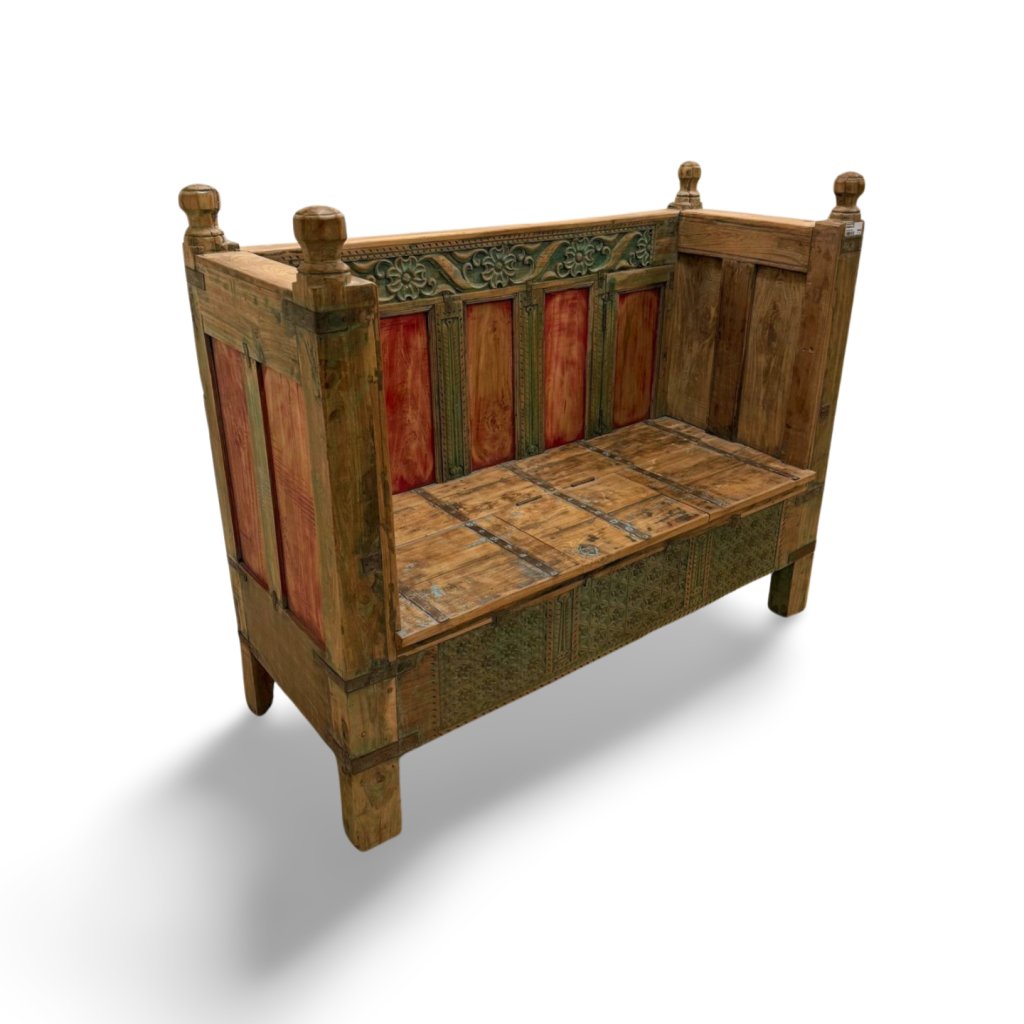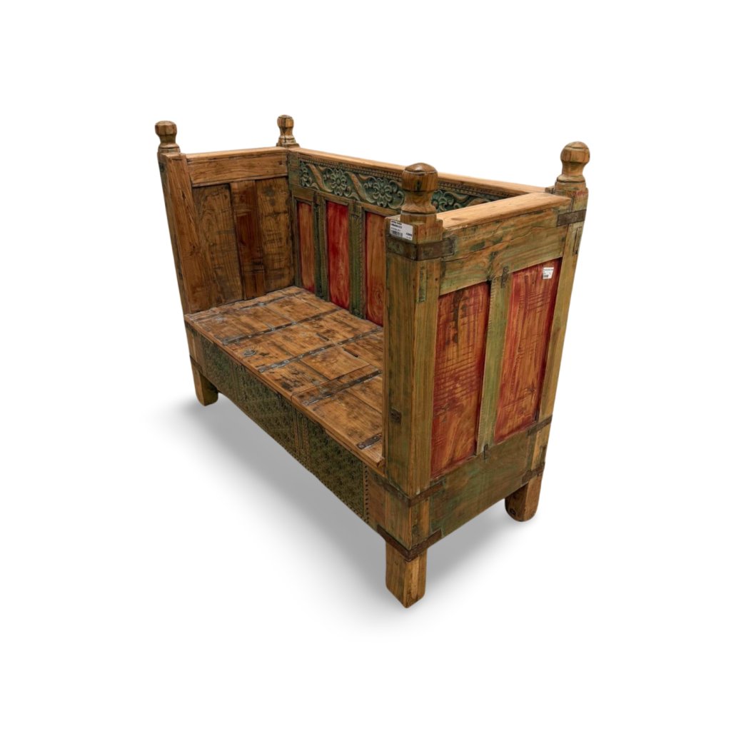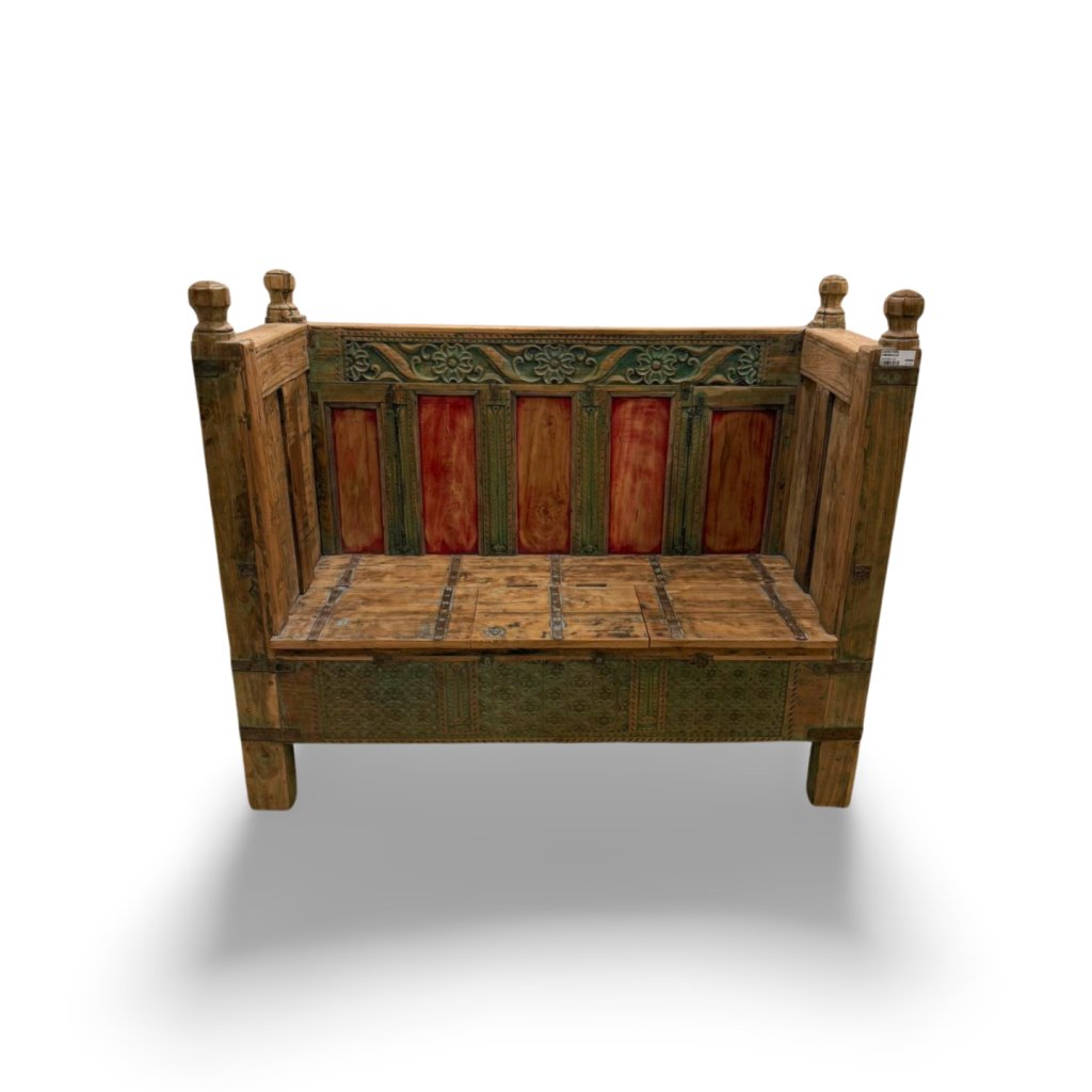 Tato lavice z masivního dřeva pochází z Indie a zaujme svým tradičním vzhledem, ručním zpracováním a bohatými dekorativními detaily. Kombinace přírodního dřeva s barevnými prvky a jemnou patinou dodává lavici autentický charakter a originální vzhled.