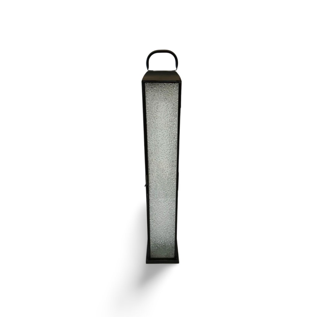 Kapkové sklo dodává lucerně zajímavý vizuální efekt a zároveň zajišťuje větší soukromí světla – plamen není vidět přímo, ale pouze jako jemná záře. Kovový rám zajišťuje stabilitu a dlouhou životnost, zatímco čistý, vertikální tvar působí elegantně a nadčasově.