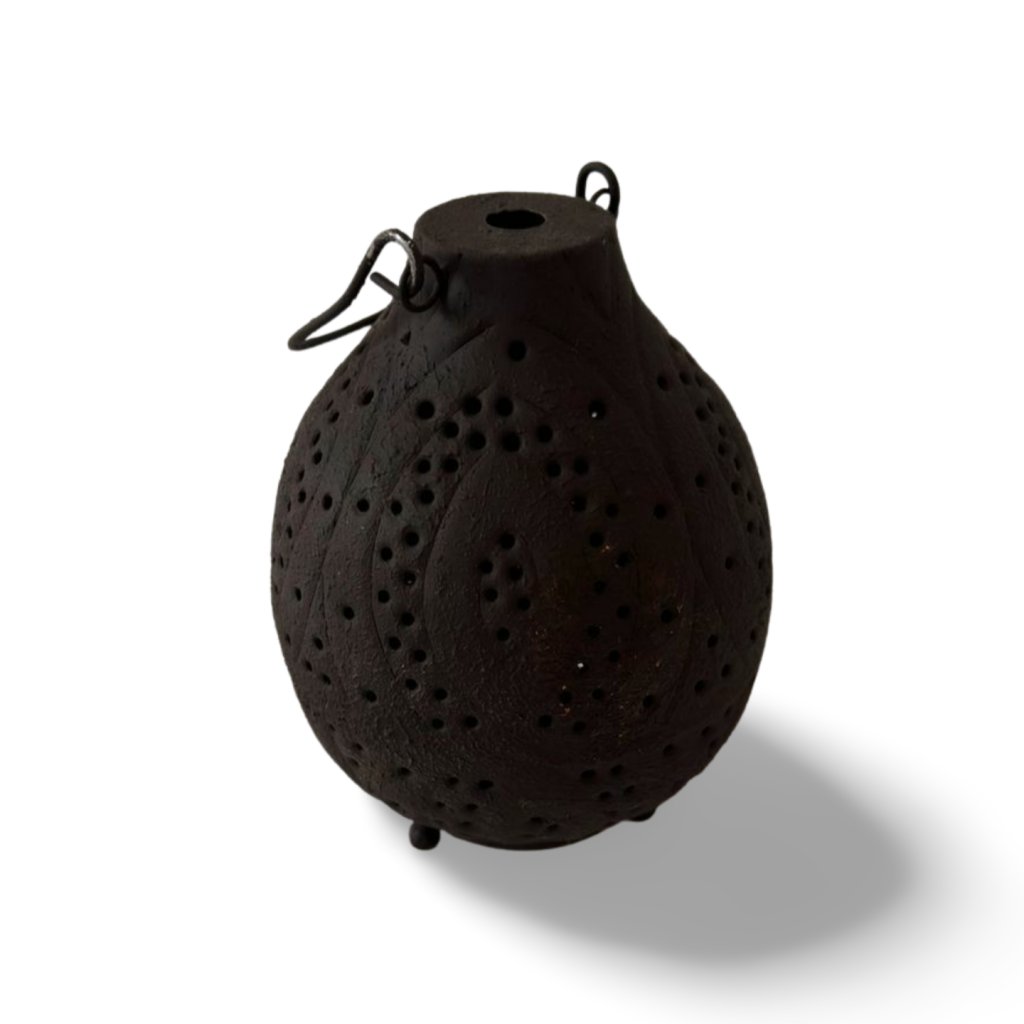 Tmavá kovová úprava podtrhuje ruční charakter lucerny a dodává jí osobitý, lehce etnický vzhled. Nepravidelnosti v tvaru a rozmístění perforace nejsou vadou, ale naopak potvrzením řemeslného zpracování a originality každého kusu.