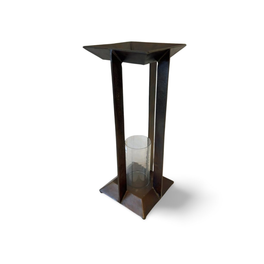 Tento kovový svícen zaujme svým výrazným architektonickým provedením a čistými, geometrickými liniemi. Pevná kovová konstrukce vytváří stabilní rám, do jehož středu je vložena skleněná nádoba pro svíčku. Celek působí moderně, vyváženě a nadčasově.