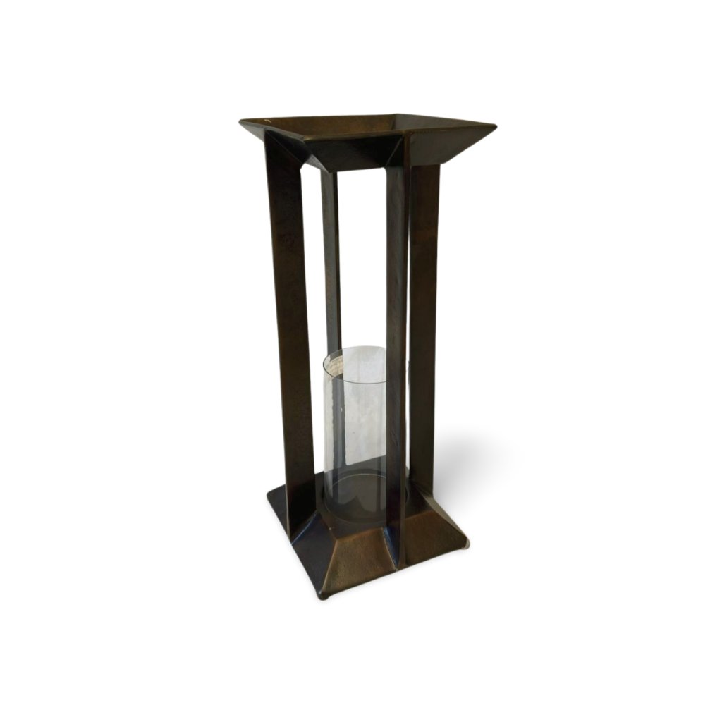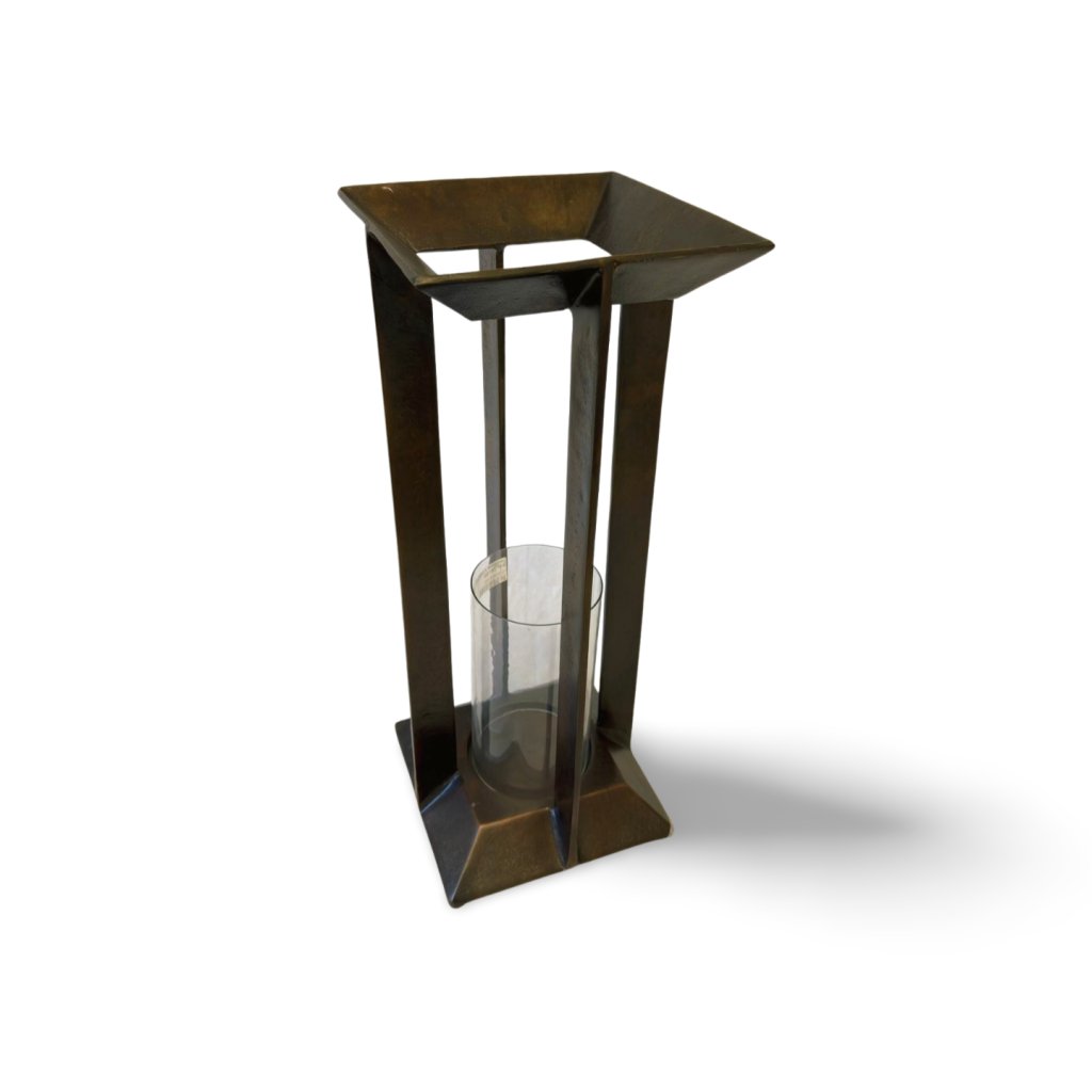 Elegantní kovový svícen s čistou architektonickou konstrukcí je doplněn cylindrickou skleněnou vložkou, která chrání plamen svíčky a zároveň podtrhuje jeho moderní vzhled.