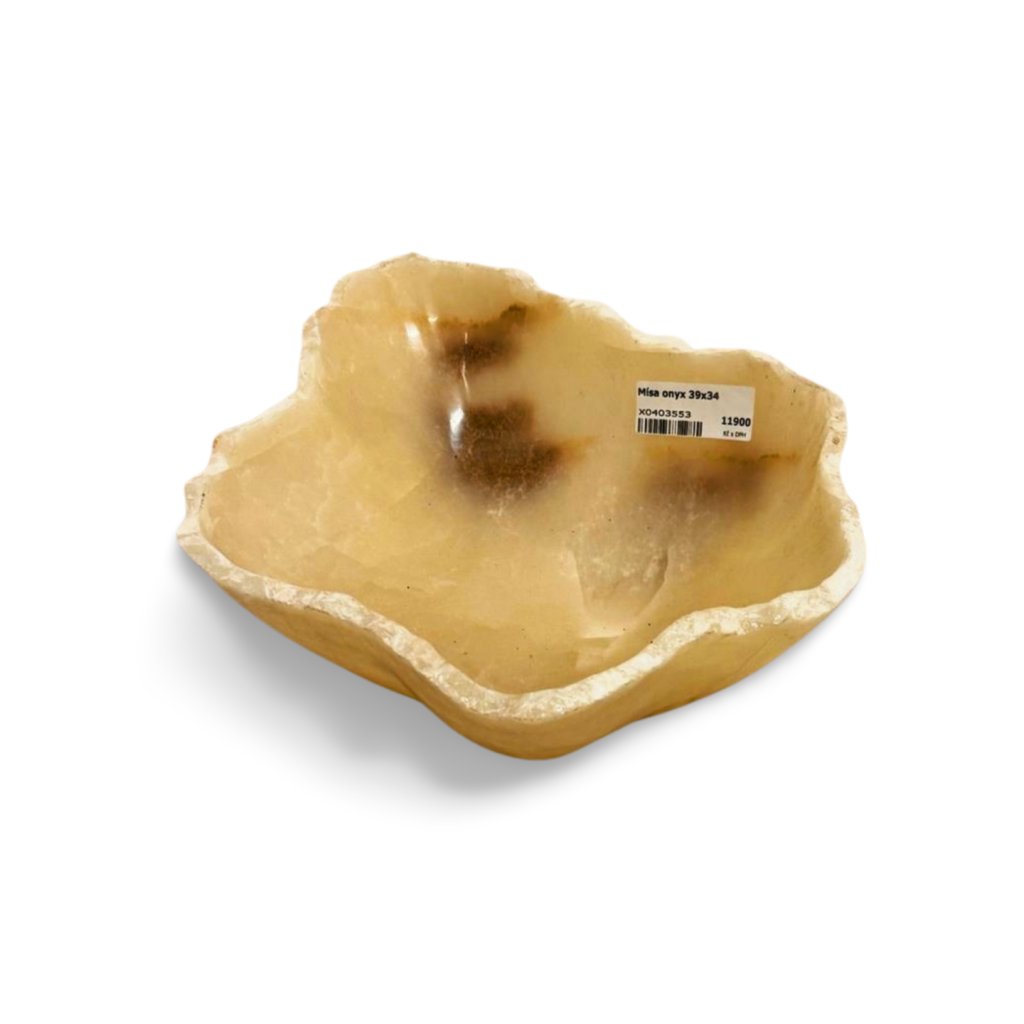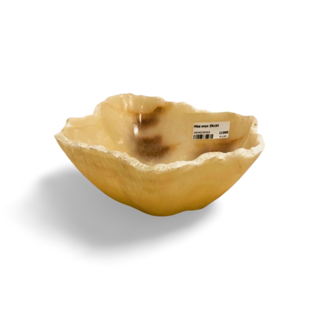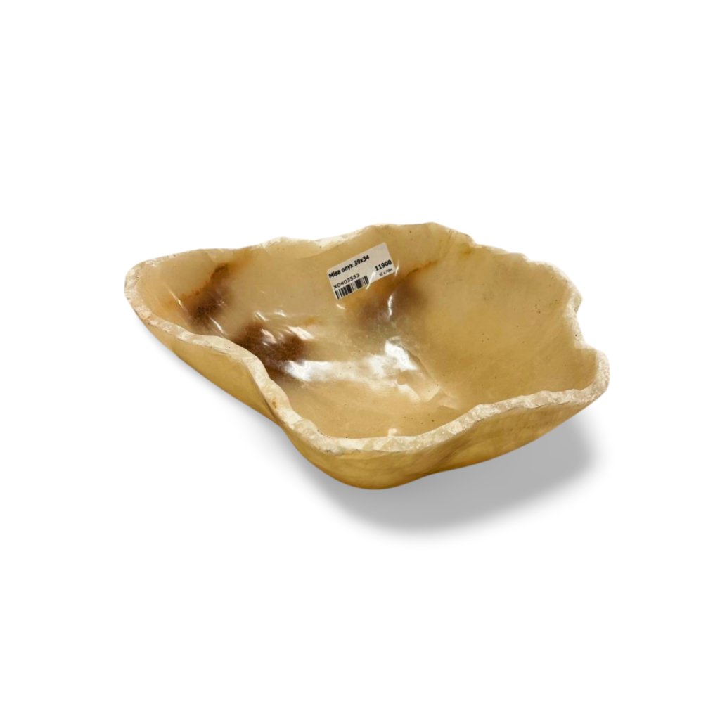 Tato mísa z přírodního onyxu je výjimečným dekorativním prvkem, který zaujme svou přirozenou kresbou, jemnou barevností a organickým tvarem. Onyx je přírodní kámen ceněný pro svou hloubku, poloprůsvitnost a luxusní vzhled, díky čemuž působí mísa elegantně a nadčasově.