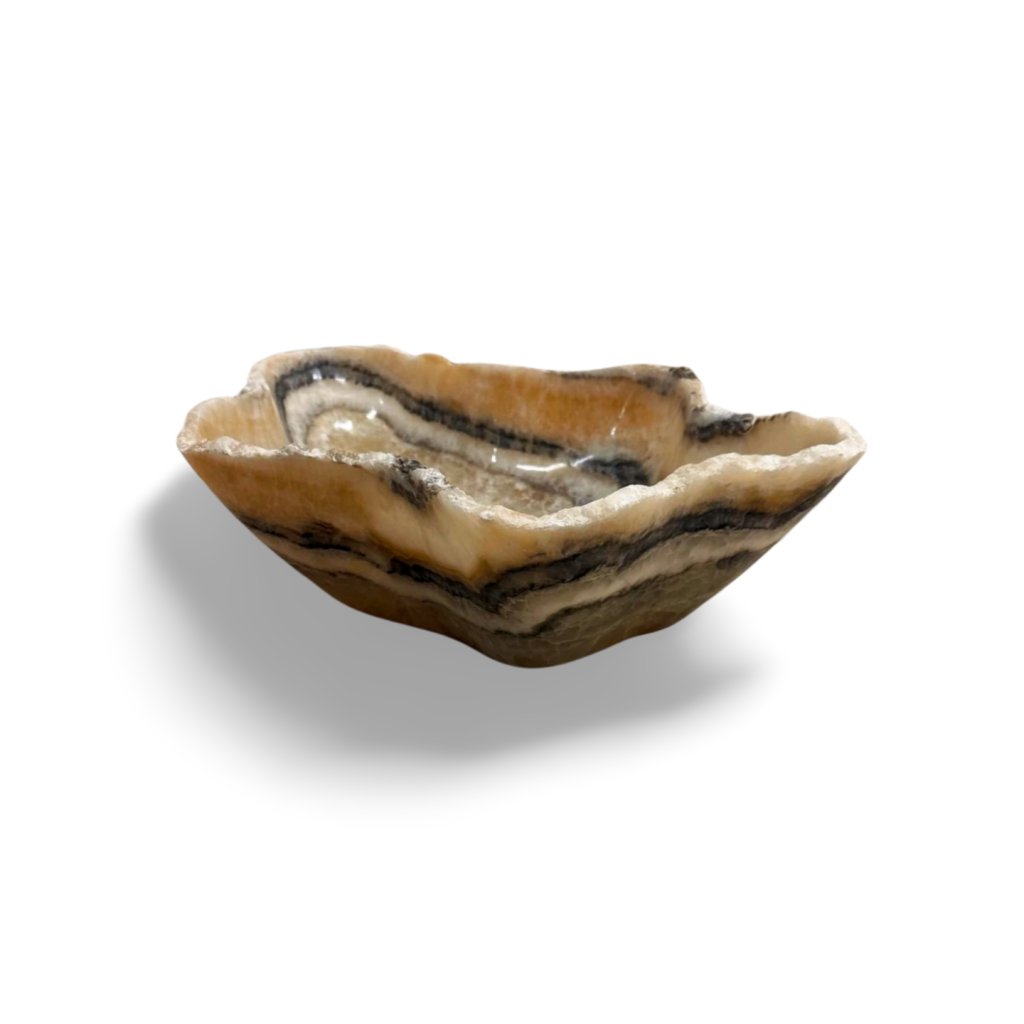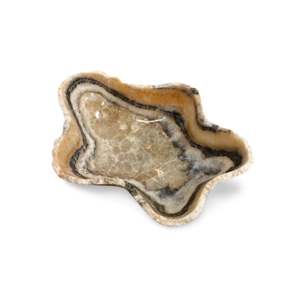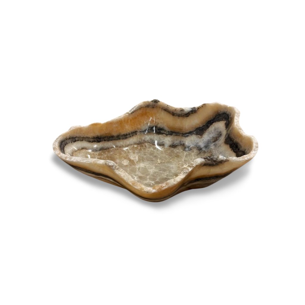 Nepravidelný tvar a zvlněný okraj podtrhují přírodní původ kamene. Každý kus je ručně opracovaný a zcela originální – žádné dvě mísy nemají stejný tvar, kresbu ani rozložení barev. Kontrast světlých a tmavších vrstev dodává míse výrazný vizuální efekt a činí z ní nepřehlédnutelný dekorativní prvek.