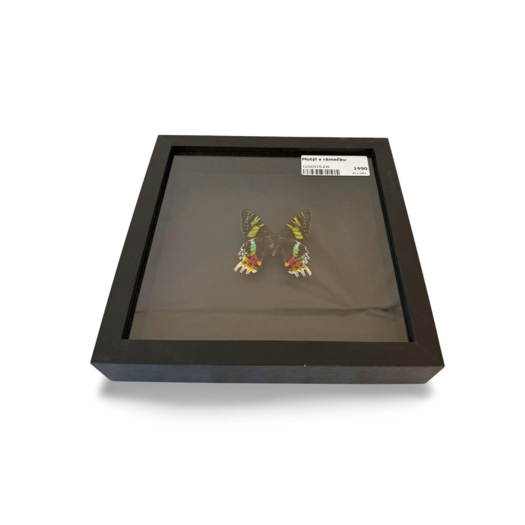 Motýl v rámečku představuje originální dekoraci, která do interiéru přináší kontrast přírody a minimalistického designu. Barevně výrazný motýl je zasazen do hlubokého černého rámu, díky kterému dokonale vynikne jeho kresba, struktura i syté barvy křídel.