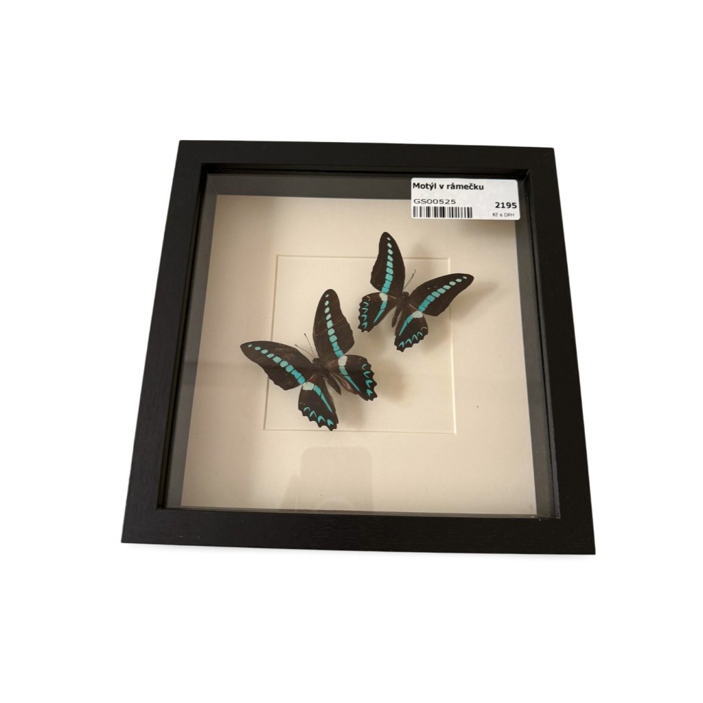 Dva motýli v rámečku tvoří působivou přírodní dekoraci, která do interiéru vnese lehkost, detail a jemný pohyb. Motýli s výrazným tyrkysovým akcentem jsou zasazeni do hlubokého černého rámu, jenž nechává vyniknout jejich tvar, kresbu křídel i prostorové uspořádání.