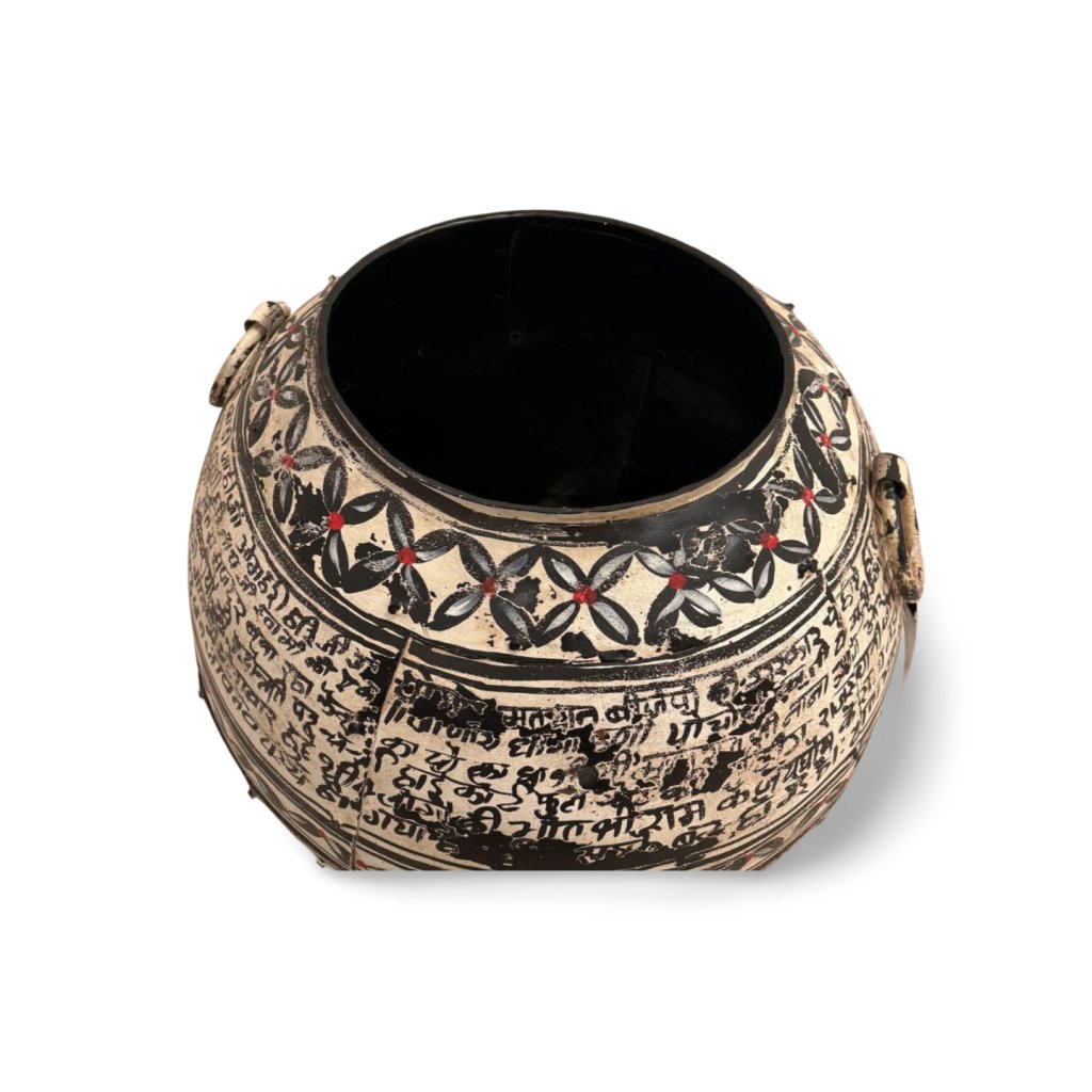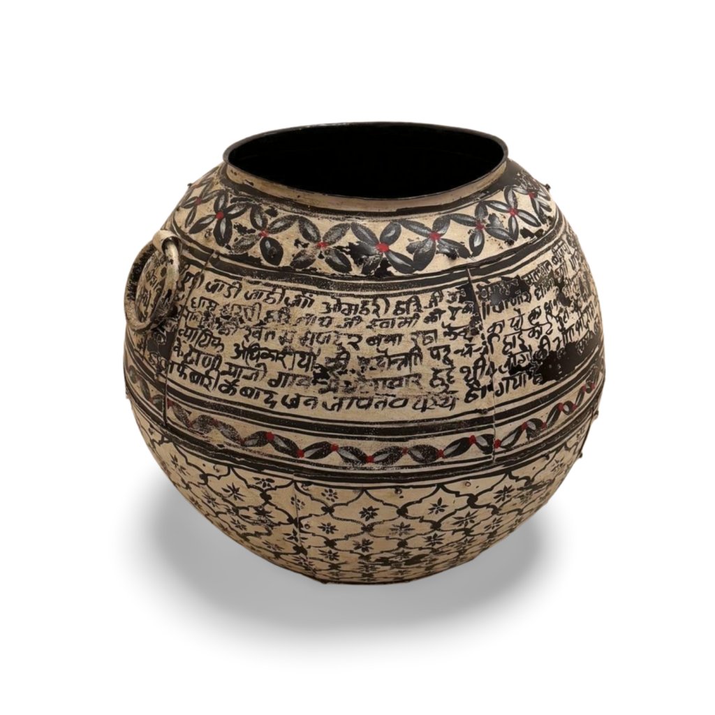 Tato ručně malovaná kovová nádoba zaujme bohatým zdobením, tradičními ornamenty a dekorativními nápisy inspirovanými orientální kulturou. Jemná patina a drobné nedokonalosti povrchu podtrhují její autentický vzhled a ruční zpracování.