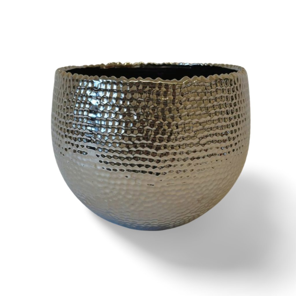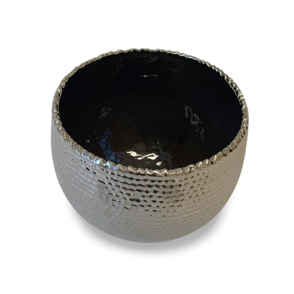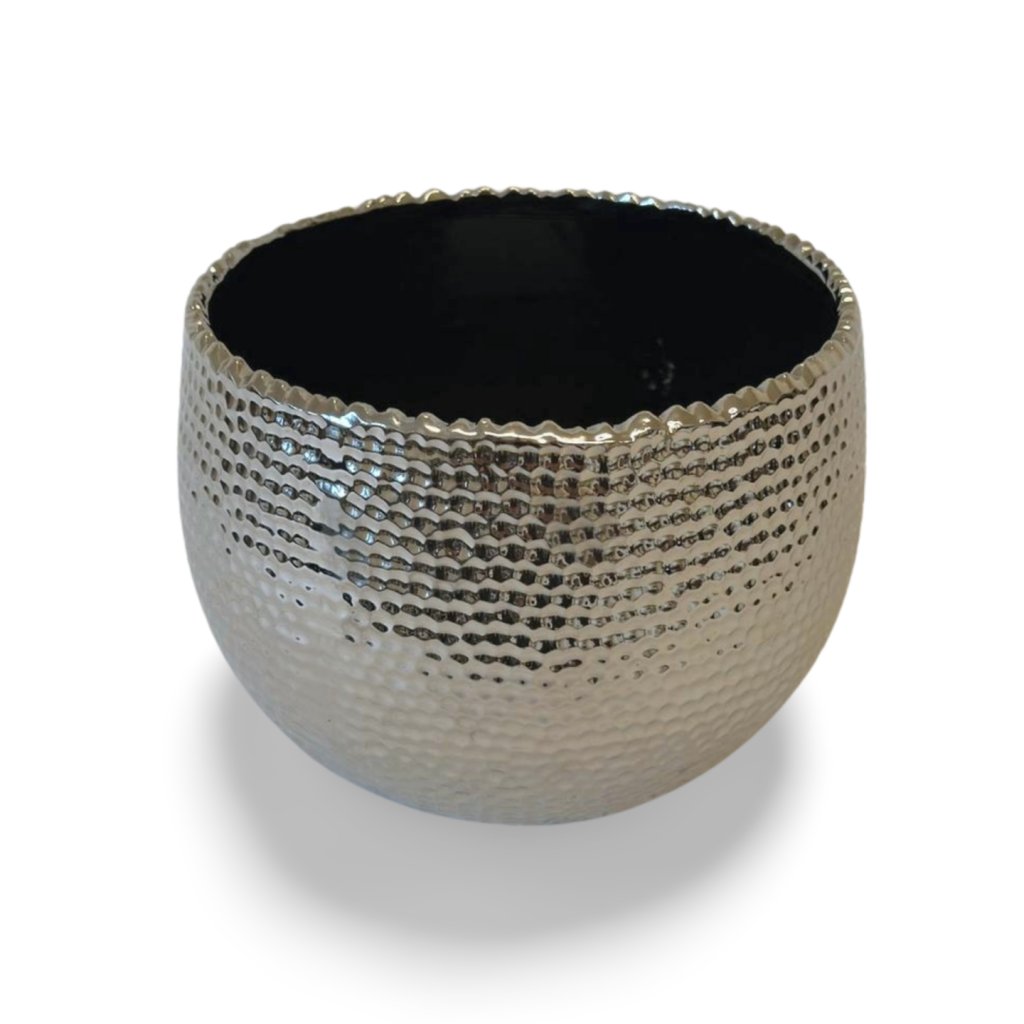 Stylová stříbrná nádoba zaujme jemně tepaným povrchem, který vytváří zajímavou hru světla a odlesků. Strukturovaný design dodává objektu hloubku a luxusní vzhled, zatímco jednoduchý kulatý tvar působí nadčasově.
