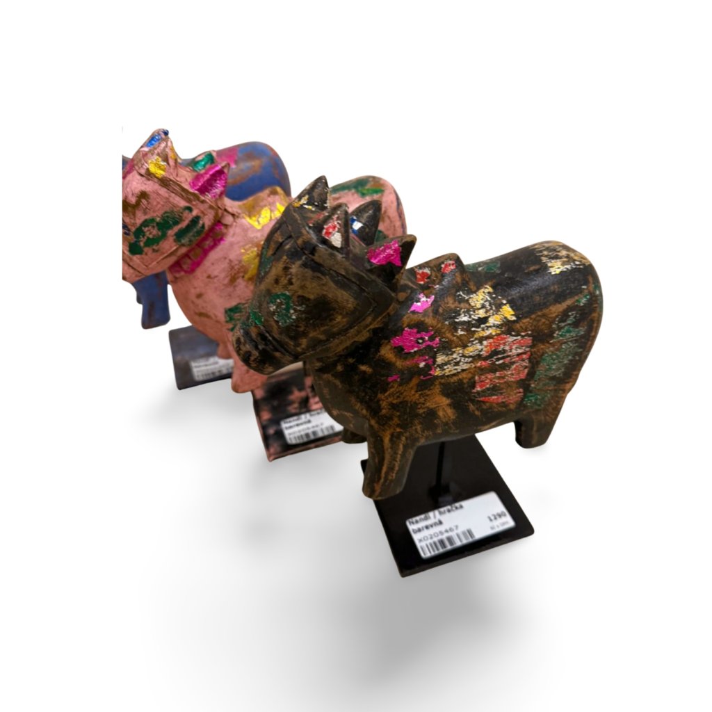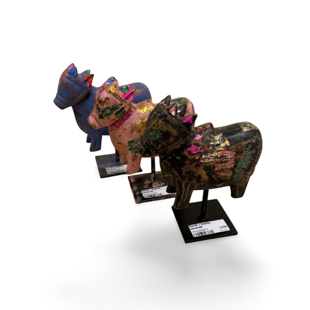Tato dřevěná dekorace Nandi představuje stylizovanou figurku inspirovanou tradiční indickou symbolikou. Je vyrobena z masivního dřeva a ručně malovaná, díky čemuž má každý kus jedinečný vzhled a osobitý charakter.