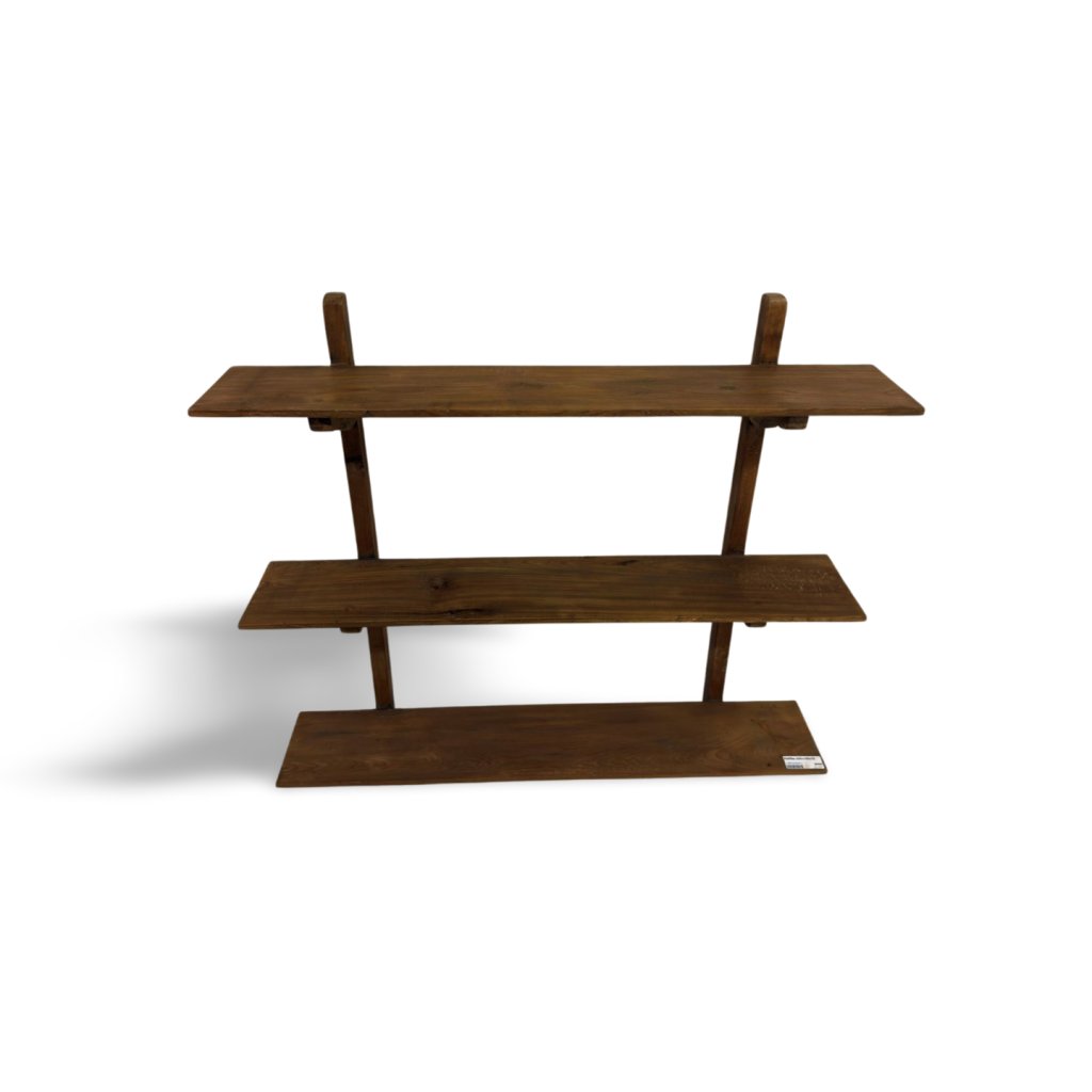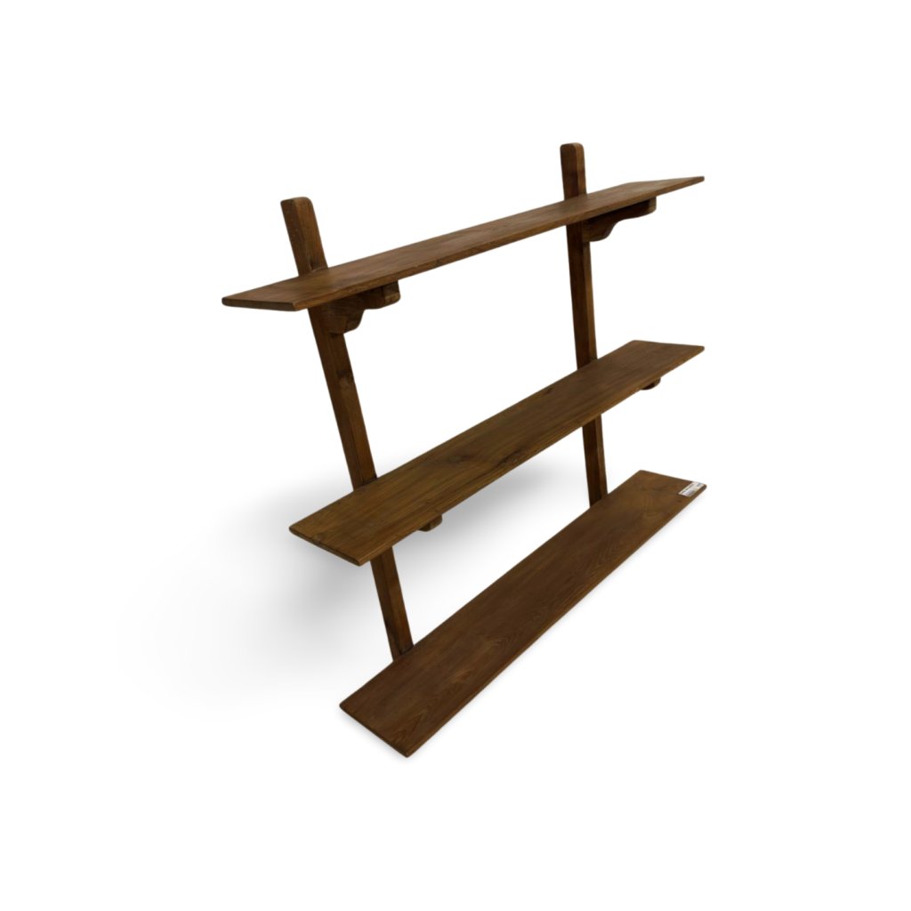 Design je jednoduchý, ale výrazný. Tři prostorné police vytvářejí praktický úložný i prezentační prostor, zatímco masivní boční konstrukce podtrhuje stabilitu a poctivé řemeslné zpracování. Každý kus je originální díky přirozené struktuře a odstínu teaku.