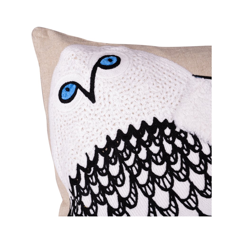 Tento dekorační polštář s motivem sovy navazuje na stejný výtvarný styl jako obraz se sovou a přenáší jej do útulné textilní podoby. Jemná kresba v kontrastu černých linií a světlého podkladu působí lehce, hravě a zároveň elegantně. Výrazné modré oči dodávají polštáři osobitý a nezaměnitelný charakter.