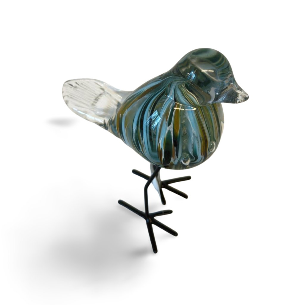 Tento dekorativní ptáček z foukaného skla zaujme výrazným barevným provedením s jemně protaženými skleněnými pruhy v tónech modré, zelené a zemitých odstínů. Transparentní ocas a lesklý povrch dodávají dekoraci lehkost a elegantní hloubku.