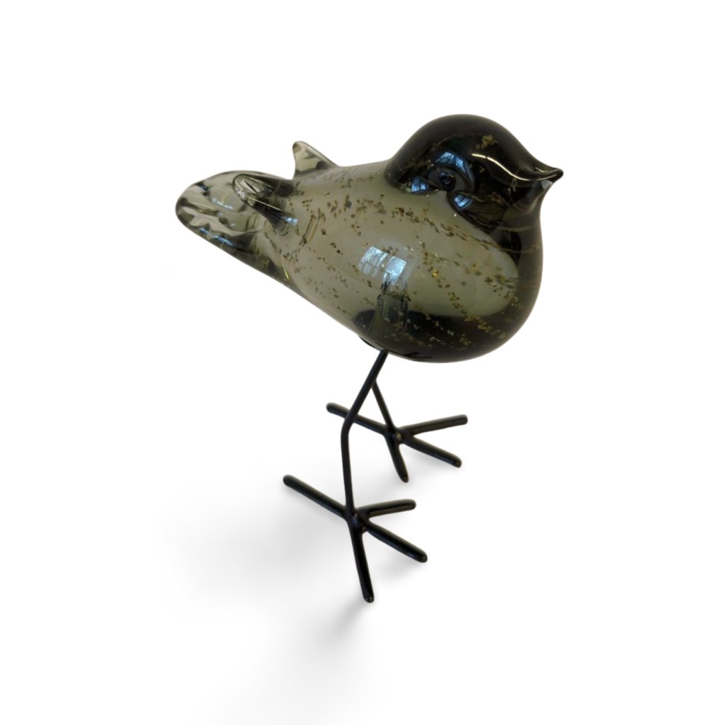 Elegantní dekorativní ptáček vyrobený z foukaného skla zaujme svým jemně zakaleným odstínem s drobnými nepravidelnými tečkami, které vytvářejí originální patinovaný efekt. Každý kus působí lehce odlišně, což podtrhuje jeho řemeslný a originální charakter.