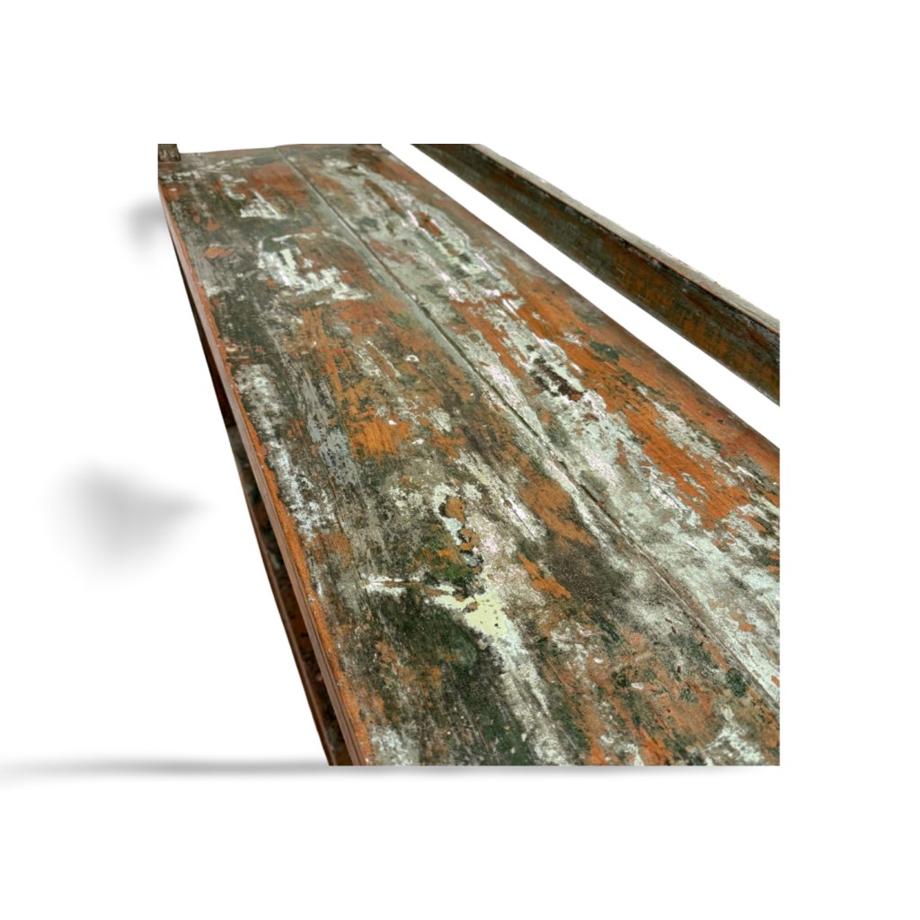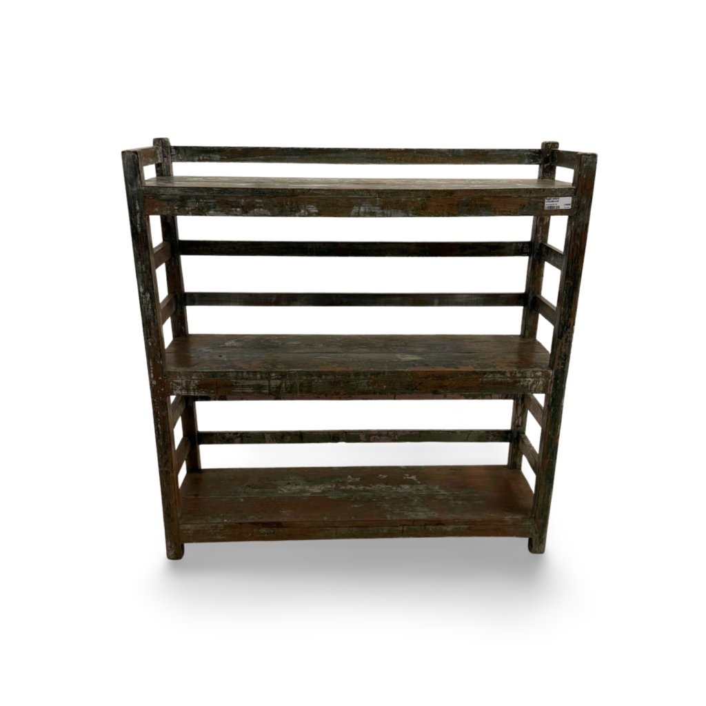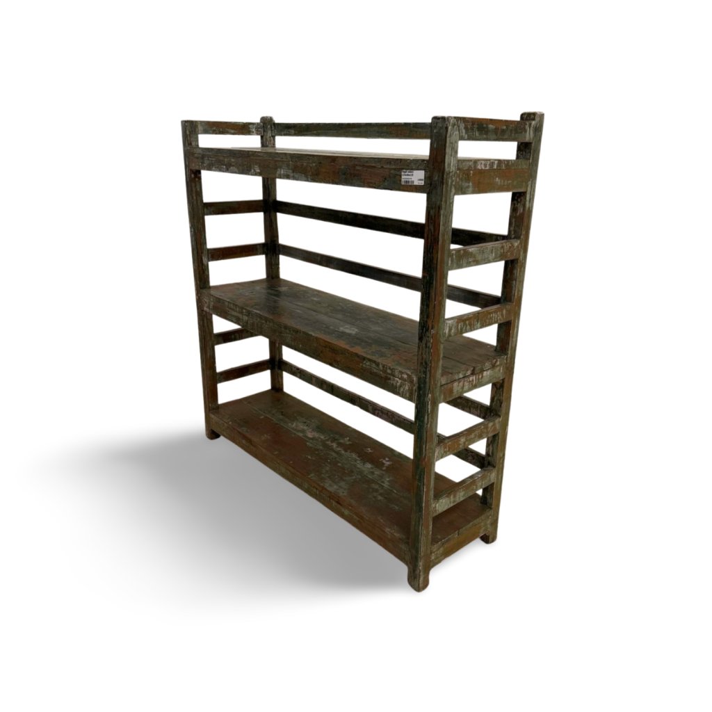 Tento dřevěný regál v zeleném provedení zaujme robustní konstrukcí, otevřenými boky a přirozeně patinovaným povrchem. Povrch dřeva nese stopy času, drobné nerovnosti a barevné nuance, které podtrhují jeho originální charakter a ruční zpracování.