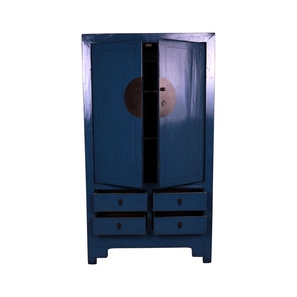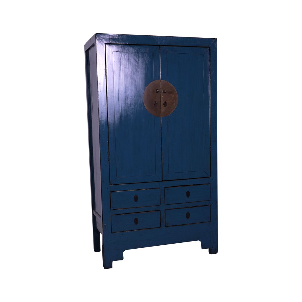 Elegantní čínská skříň v hluboké tmavě modré barvě přináší do interiéru nádech tajemna, klidu a kultivovanosti. Výrazný lakovaný povrch zvýrazňuje linie nábytku a dodává mu hloubku a lesk. Dvoje dvířka ukrývají velkorysý úložný prostor, zatímco čtyři zásuvky ve spodní části nabízejí praktické místo pro uložení drobností. Tento sofistikovaný kus nábytku spojuje tradiční čínské řemeslo s nadčasovým designem a stane se přirozenou dominantou každého interiéru.