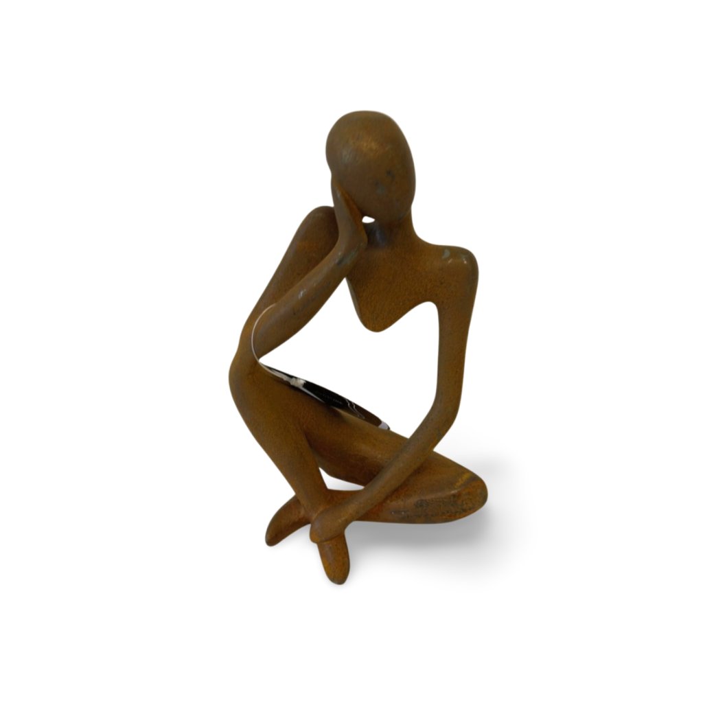 Soška evokuje ticho, soustředění a vnitřní klid – ideální kontrapunkt k rušnému modernímu interiéru. Povrch je opatřen přírodní kovovou patinou v teplých hnědo-bronzových tónech, která podtrhuje sochařský charakter a dodává plastice hloubku a autenticitu.