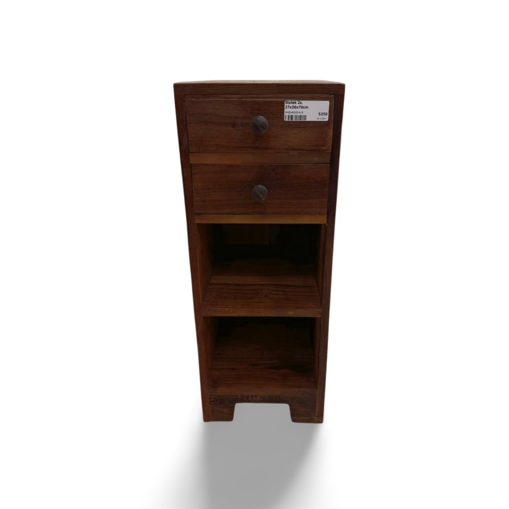 Dvě zásuvky s kulatými úchyty poskytují uzavřený úložný prostor pro drobnosti, dokumenty nebo osobní věci. Pod nimi se nacházejí dvě otevřené police, které jsou ideální pro knihy, dekorace nebo věci, které chcete mít po ruce. Kombinace zásuvek a polic dělá ze stolku velmi univerzální kus nábytku.