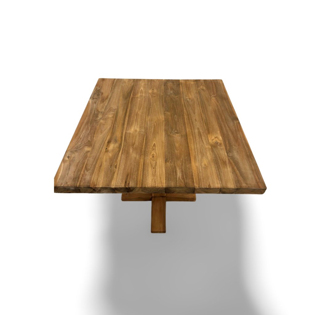 Masivní deska stolu zdůrazňuje přirozenou kresbu teakového dřeva, jeho jemné barevné přechody i originální strukturu letokruhů. Každý kus je jedinečný – teak je materiál s vysokým obsahem přírodních olejů, díky kterým je mimořádně odolný a pevný.
