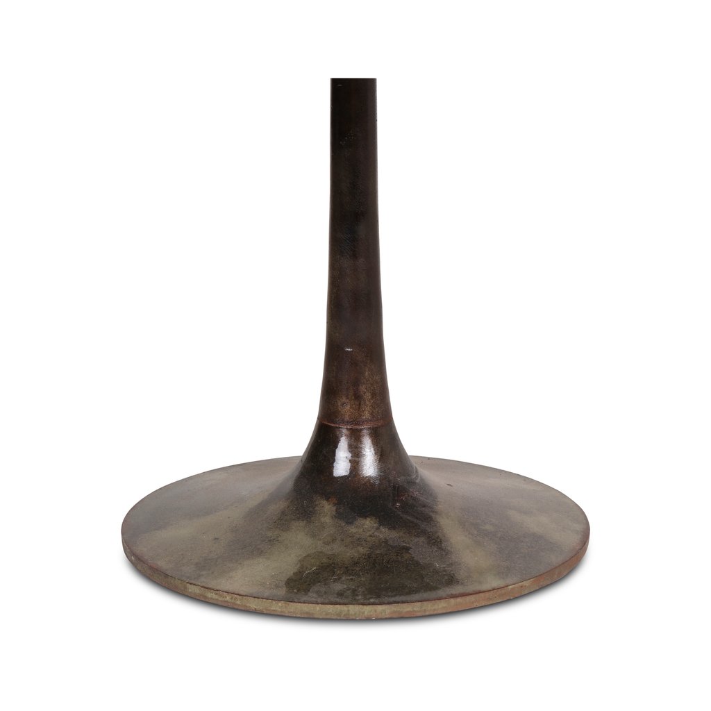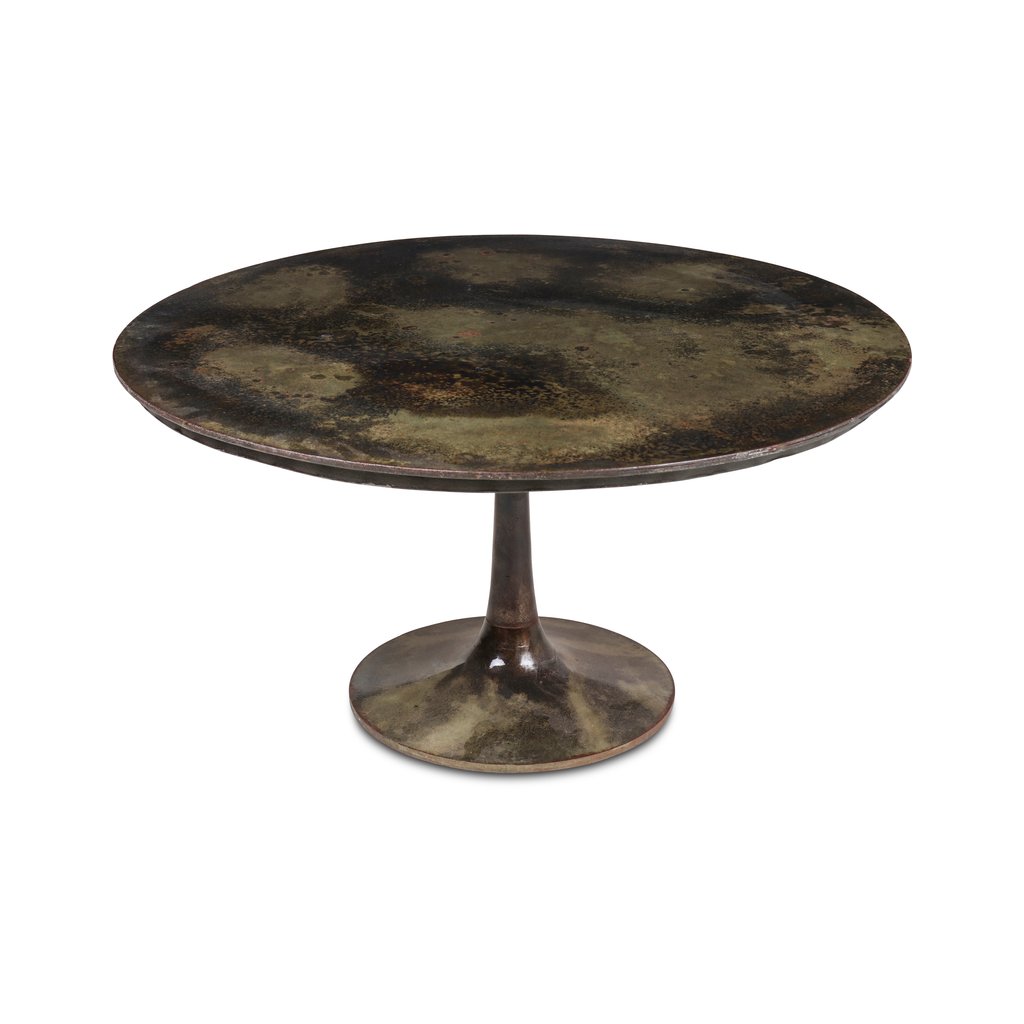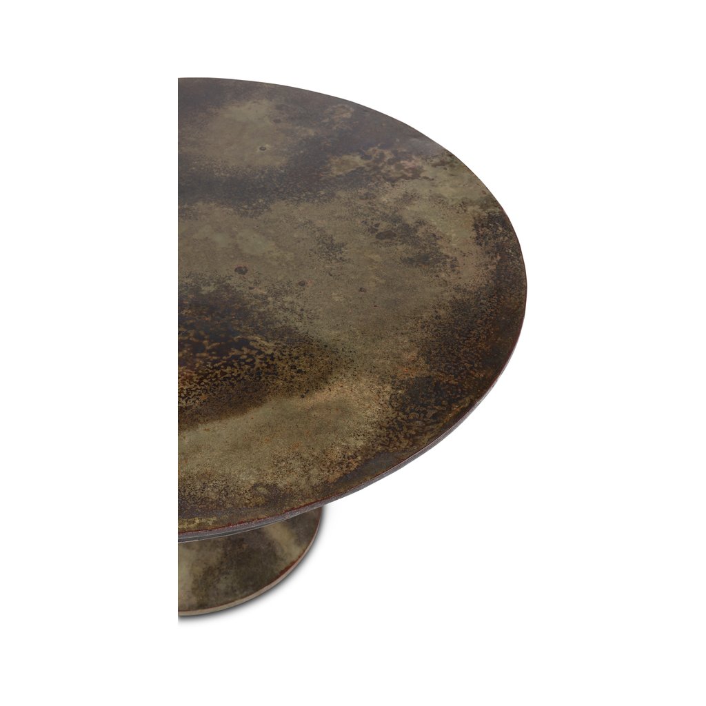 Tento konferenční stolek zaujme na první pohled svým kovovým provedením s výraznou patinou, která každému kusu dodává originální a lehce industriální charakter. Kulatá deska plynule navazuje na centrální nohu s pevnou základnou, díky čemuž stolek působí stabilně, vyváženě a vizuálně čistě.