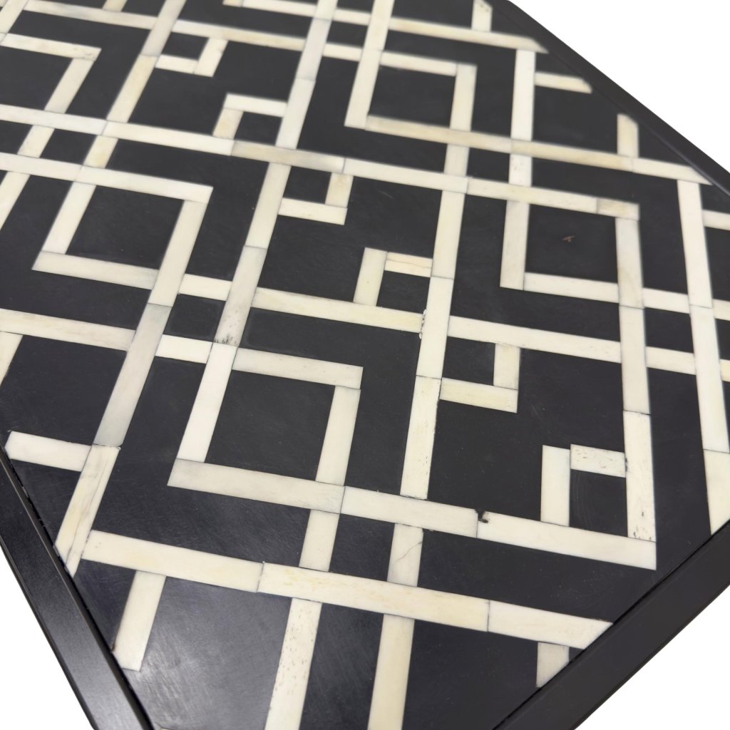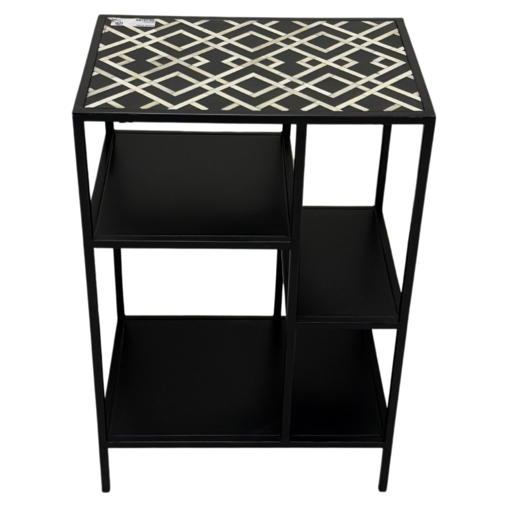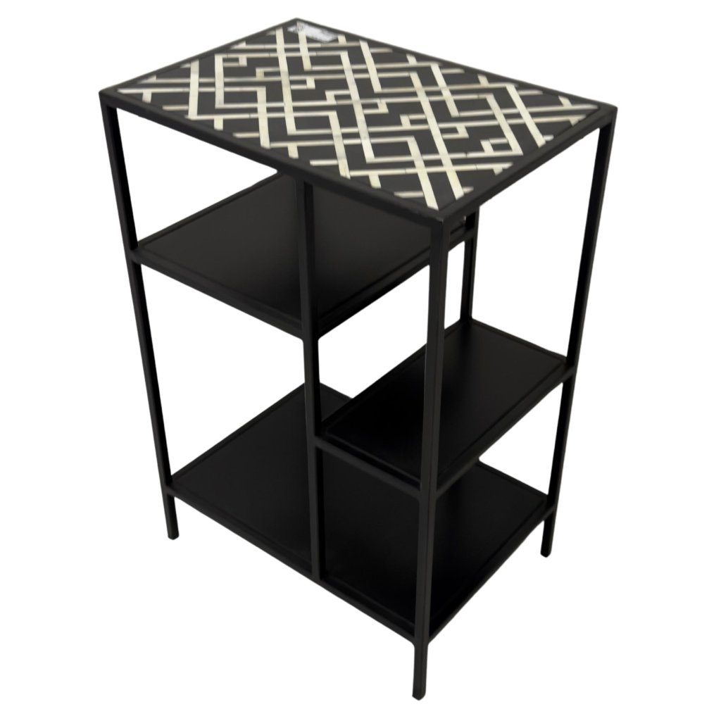 Tento malý černý kovový stolek kombinuje praktické funkce s dekorativními prvky. Disponuje poličkami, které poskytují úložný prostor pro drobnosti, a elegantní vrchní deskou, na které se nachází jemné bílé vzory. Jeho kontrastní černý rám a zdobení bílými motivy vytvářejí atraktivní vzhled, který vynikne v moderních i tradičních interiérech. Ideální jako odkládací stolek do obývacího pokoje, ložnice nebo předsíně, kde přidá prostoru sofistikovaný a stylový prvek.