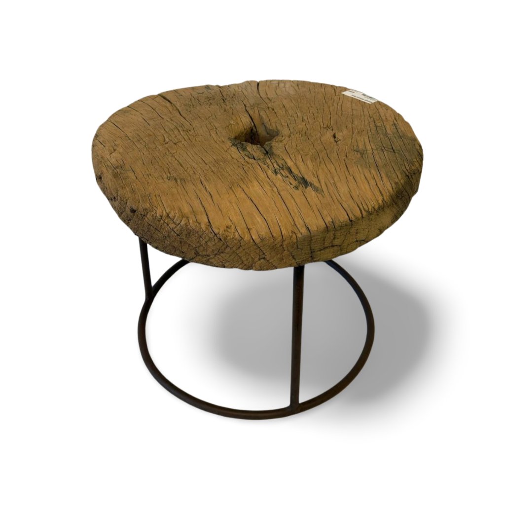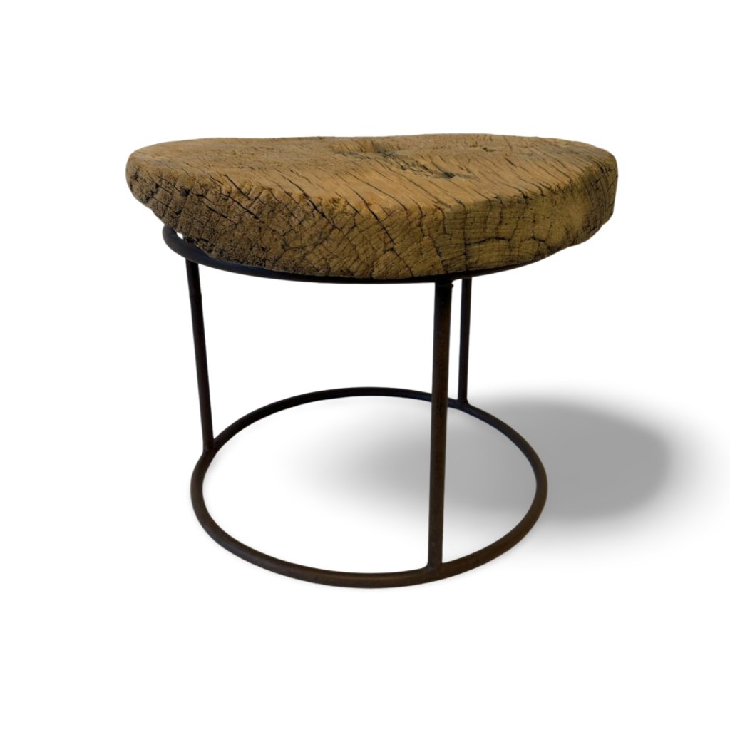 Surová krása masivu kontrastuje s jednoduchou kovovou podnoží, která dodává stolku moderní a lehce industriální výraz. Díky kompaktním rozměrům se hodí jako odkládací stolek vedle pohovky, noční stolek nebo solitérní prvek do menšího prostoru.