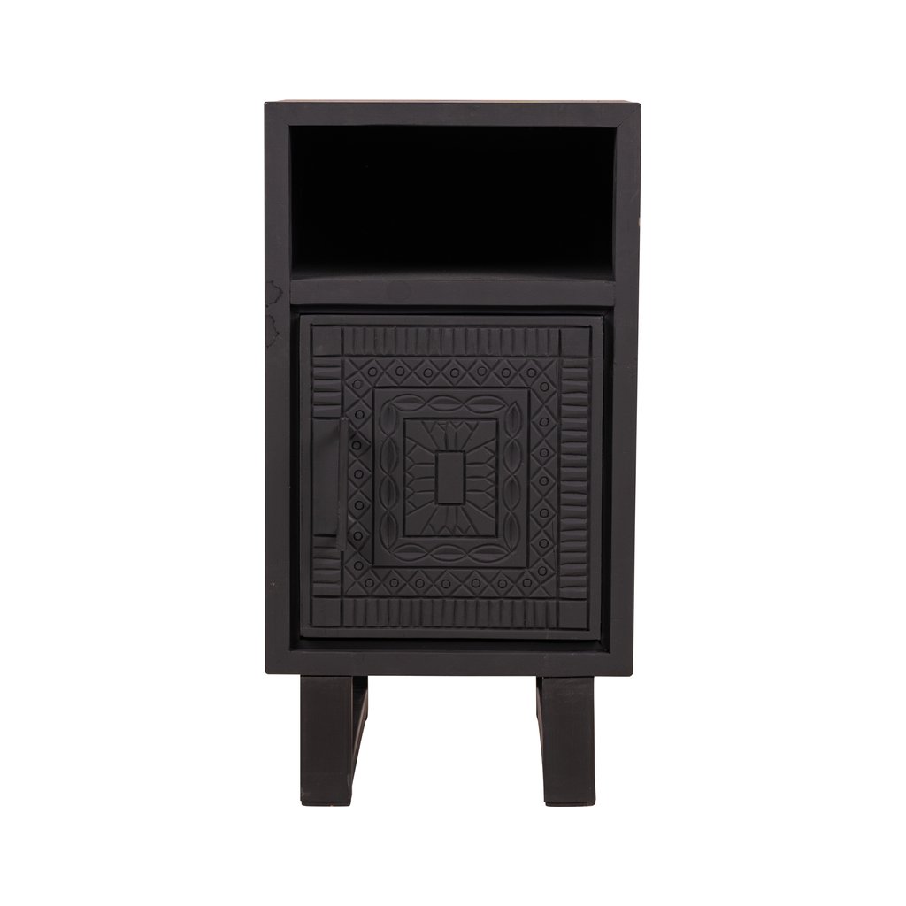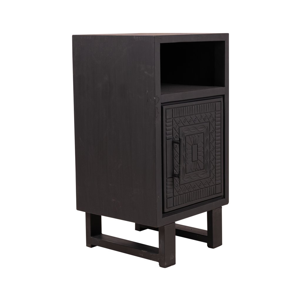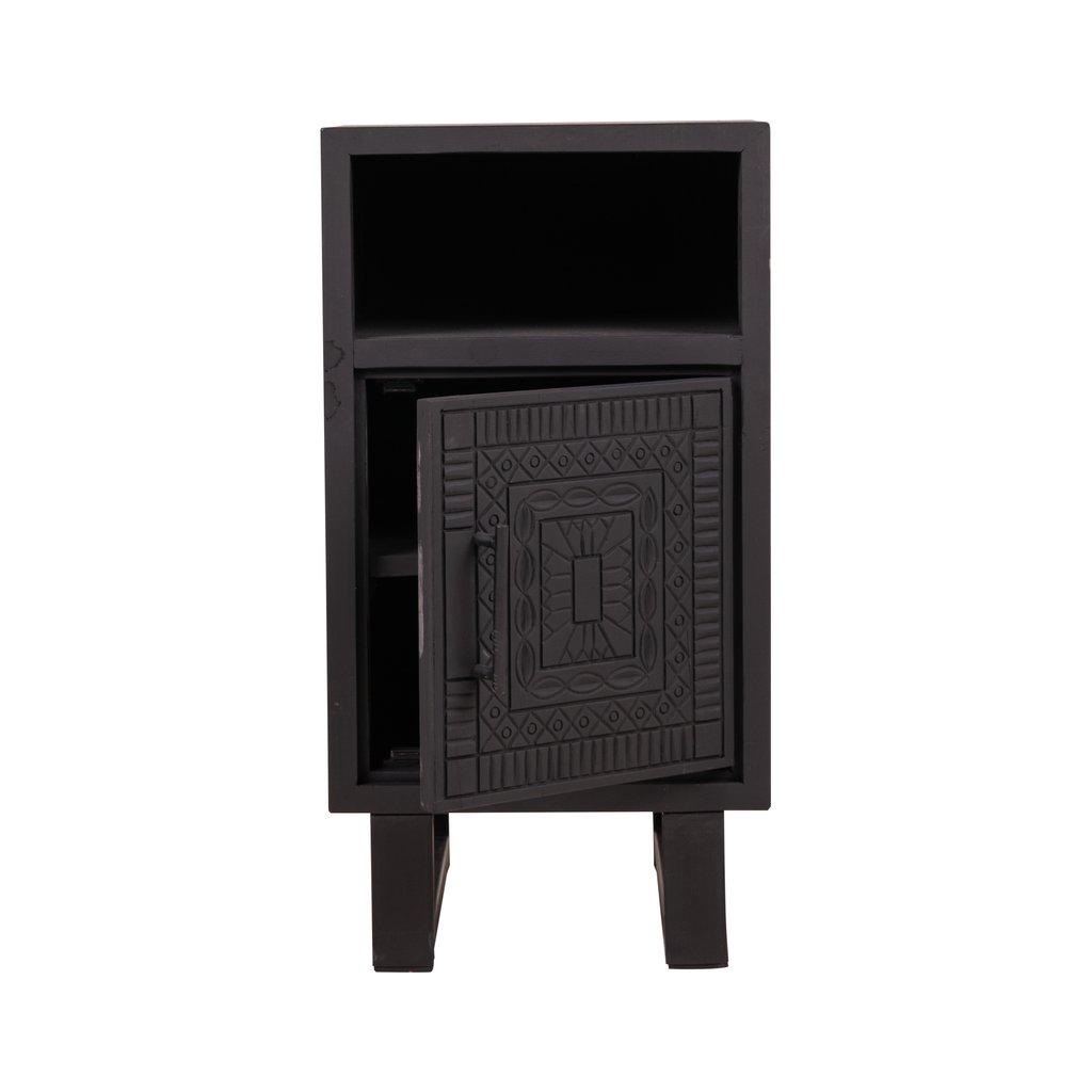 Masivní konstrukce stojí na pevném rámu, díky čemuž působí stolek stabilně a robustně. Reliéfní vzor na dvířkách přináší jemný etnický až industriální akcent, který skvěle zapadne do moderních, loftových i exoticky laděných interiérů.