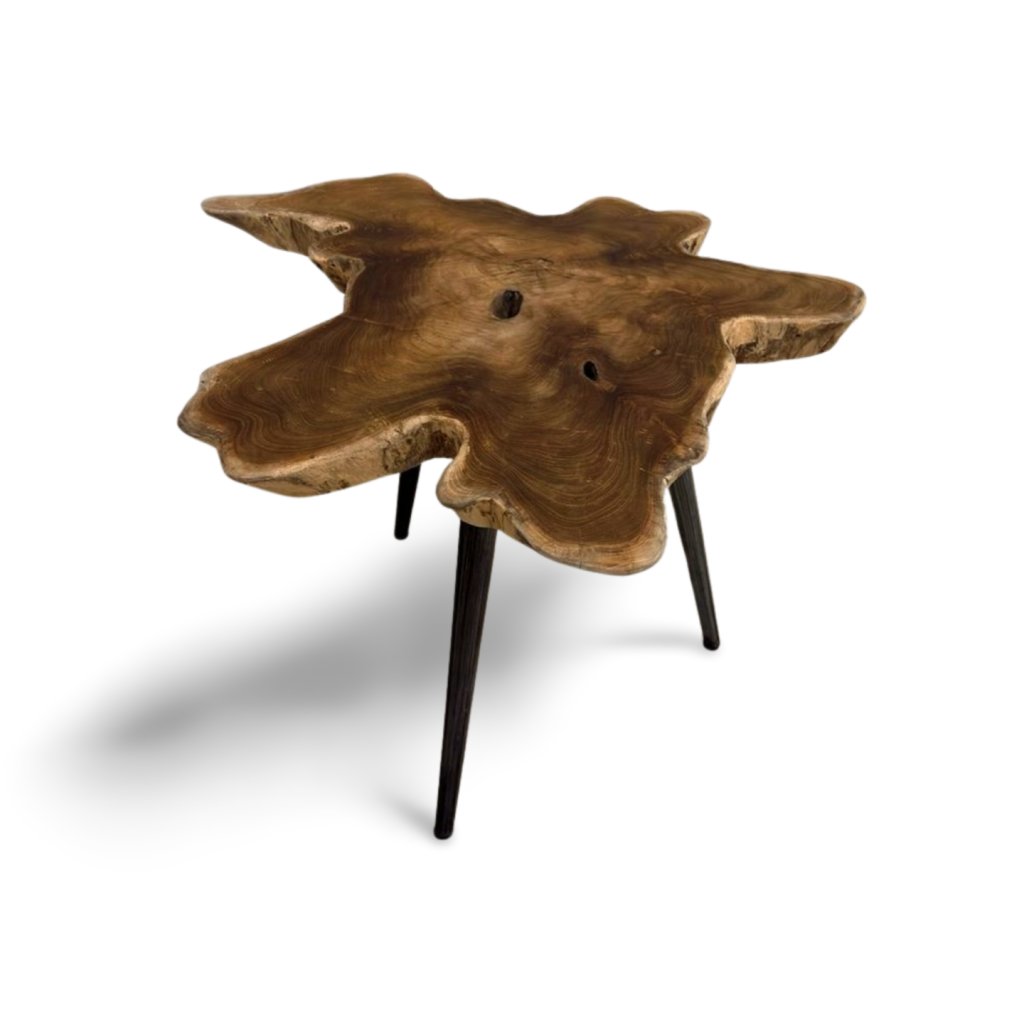 Deska stolku je vytvořena z přirozeného kořene stromu, díky čemuž má každý kus originální tvar i strukturu. Nepravidelné hrany a přirozené linie zdůrazňují charakter masivního dřeva.
