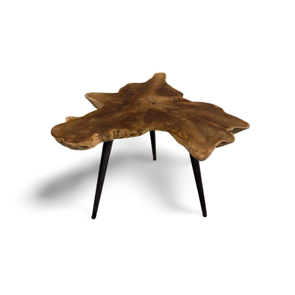 Deska stolku je vytvořena z přirozeného kořene stromu, díky čemuž má každý kus originální tvar i strukturu. Nepravidelné hrany a přirozené linie zdůrazňují charakter masivního dřeva.