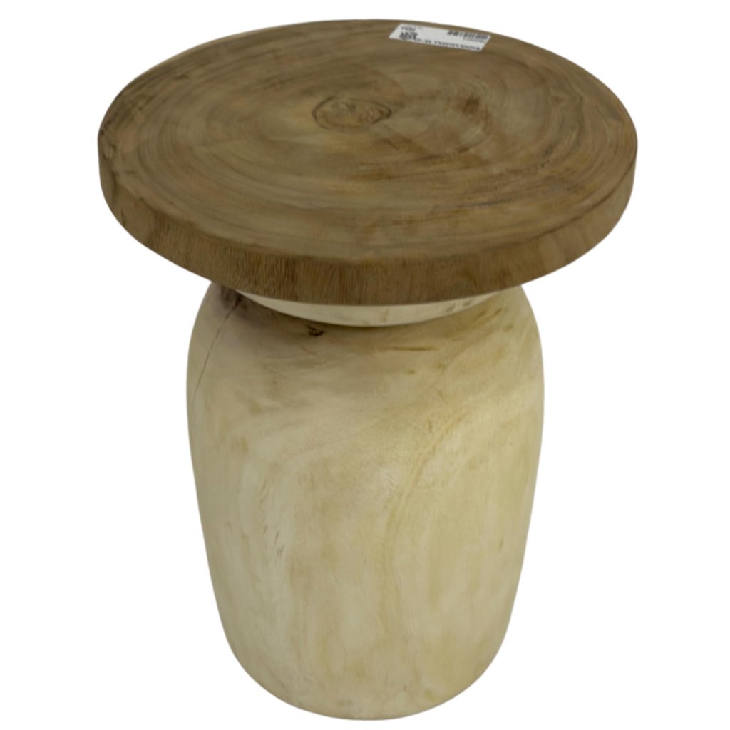Tento dřevěný stolek/stolička vyniká svou robustní konstrukcí a originálním designem. Spodní část stolu má světlý odstín dřeva, který kontrastuje s tmavší vrchní deskou, čímž vzniká výrazný vizuální efekt. Je ideálním kouskem do interiérů, které hledají nábytek s osobitým a přírodním vzhledem. Tento stolek/stolička může sloužit jako praktický a stylový doplněk, který zaujme svou jedinečnou formou a funkčností.