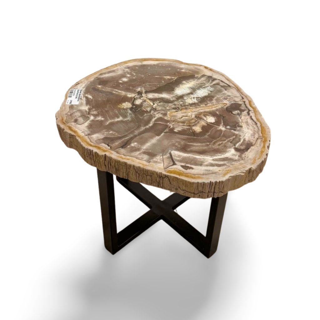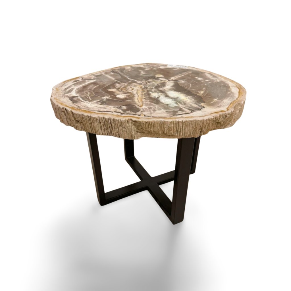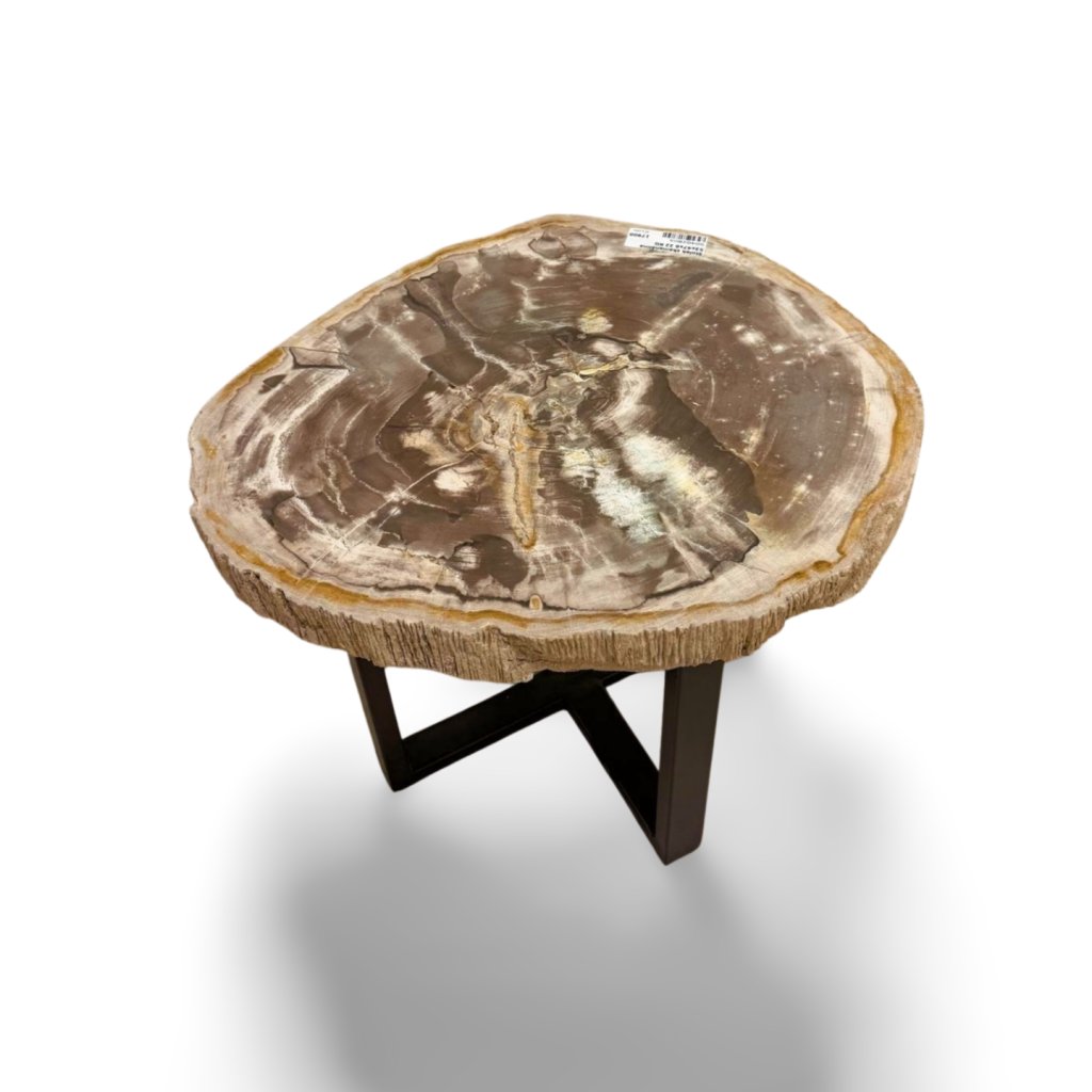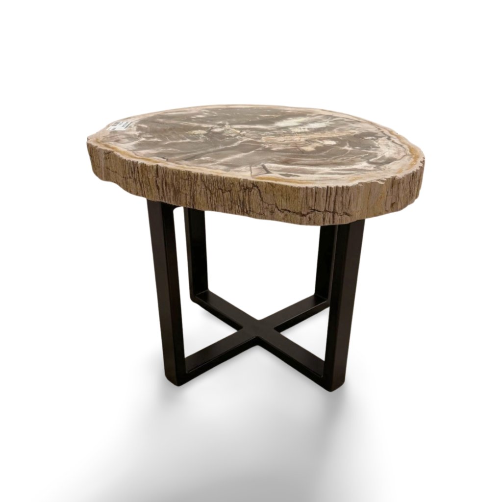 Masivní kamenná deska si zachovává přirozený tvar i surovou strukturu okraje, zatímco horní plocha je hladce leštěná a zvýrazňuje jedinečnou kresbu zkamenělého dřeva. Stabilní kovová podnož dodává stolku moderní kontrast a zajišťuje pevnost i dlouhou životnost.