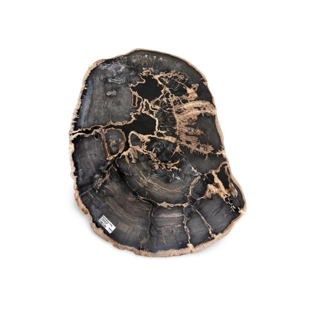 Masivní deska o hmotnosti 116 kg si zachovává přirozený nepravidelný tvar i surový okraj, zatímco horní plocha je leštěná a zvýrazňuje dramatickou strukturu a barevné kontrasty zkamenělého dřeva. Každá žíla, prasklina a přechod barev je autentickým otiskem přírodních procesů starých miliony let.