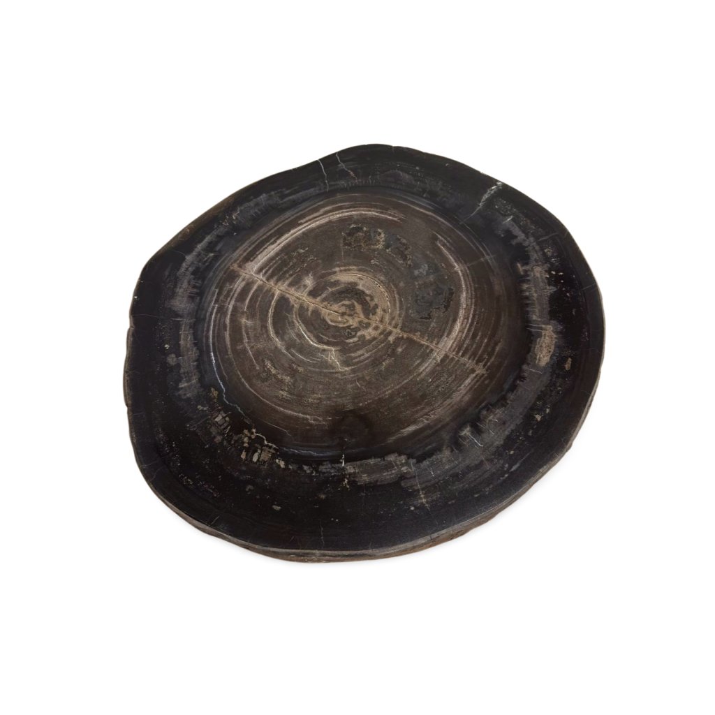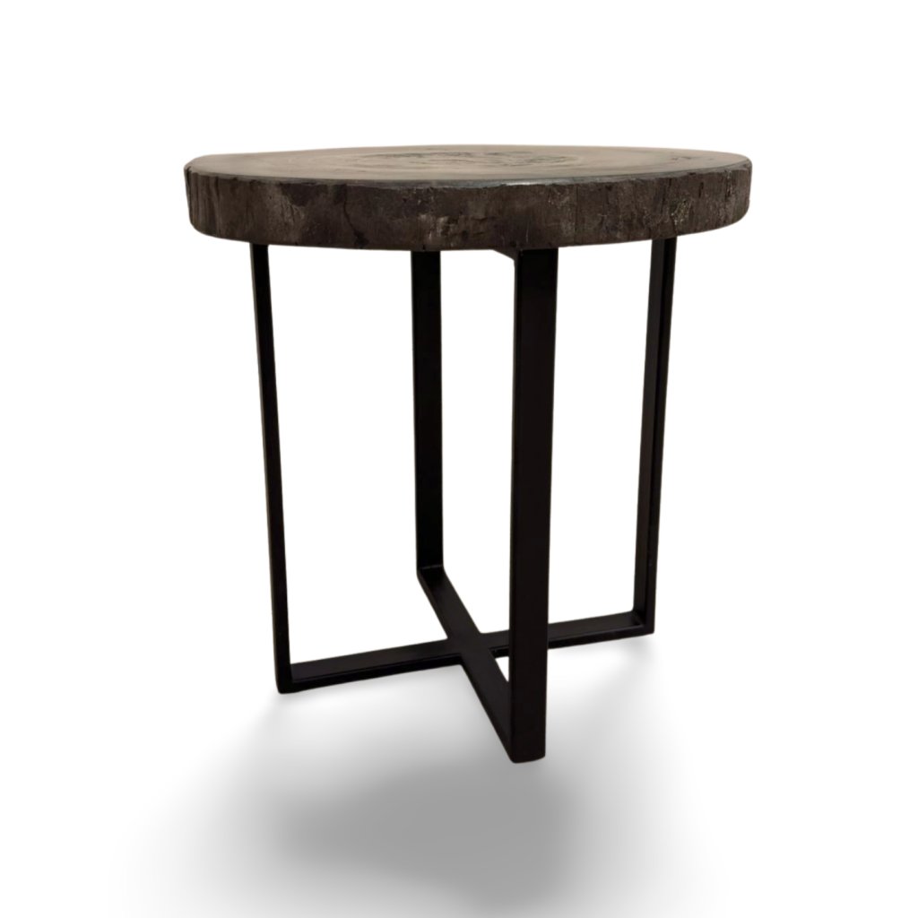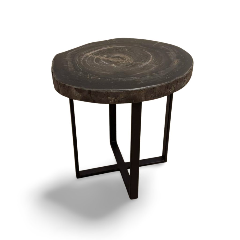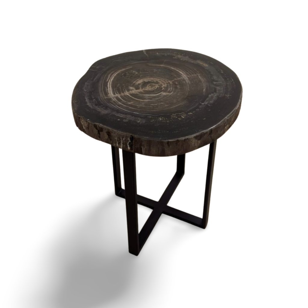 Horní deska stolku je tvořena masivním řezem zkamenělého dřeva s výraznými kruhovými liniemi a přirozenou strukturou. Povrch je pečlivě leštěný, aby vynikly detaily fosilizovaného materiálu a jeho jedinečné barevné odstíny od tmavě hnědé až po téměř černé tóny.