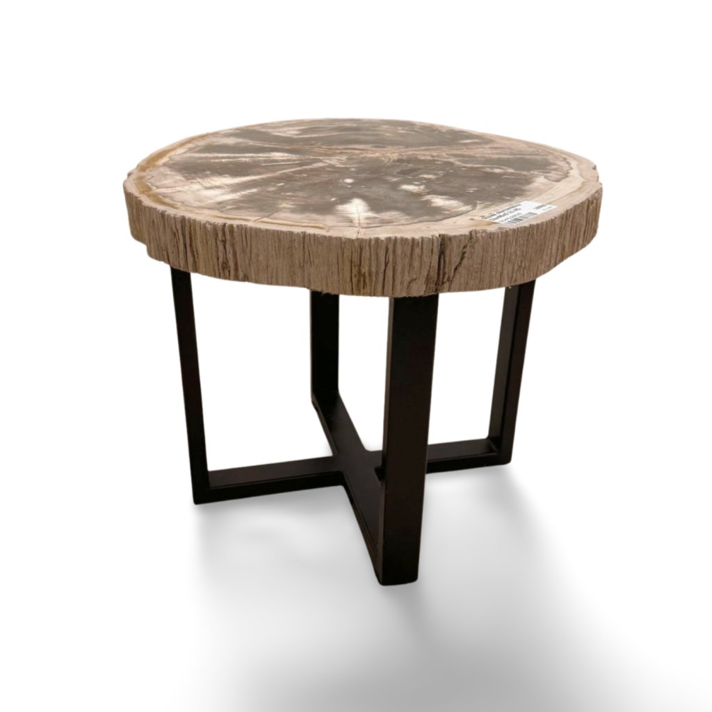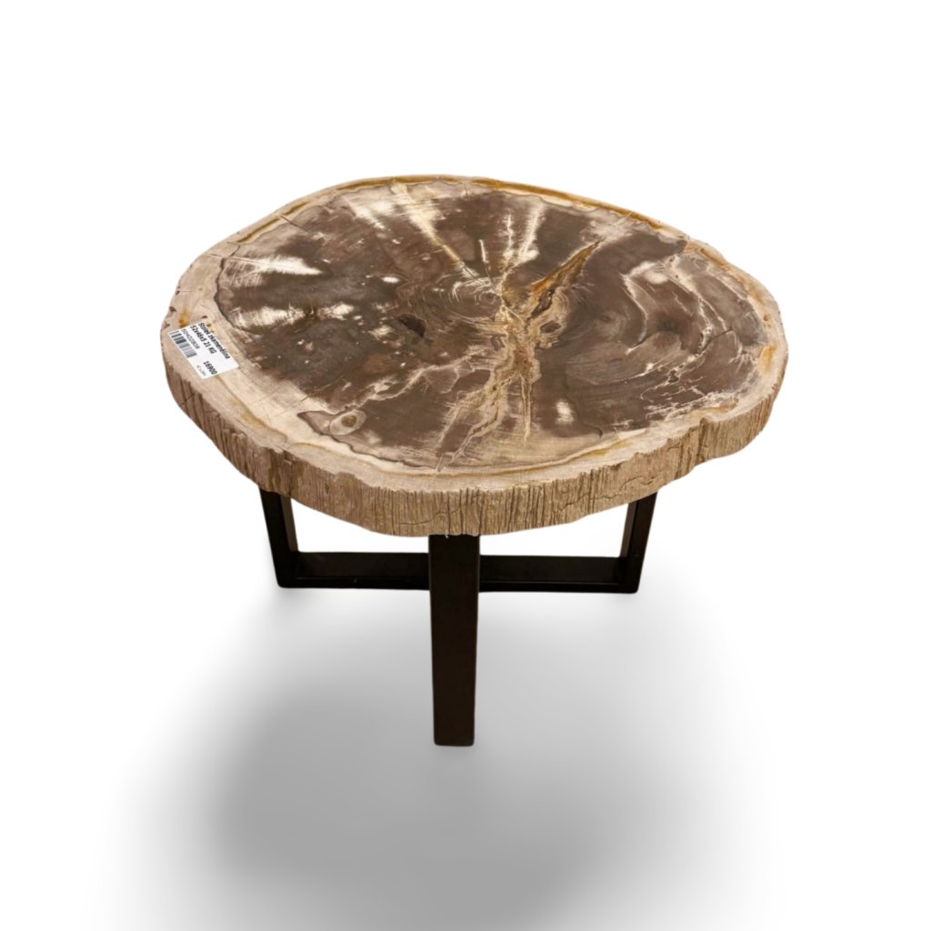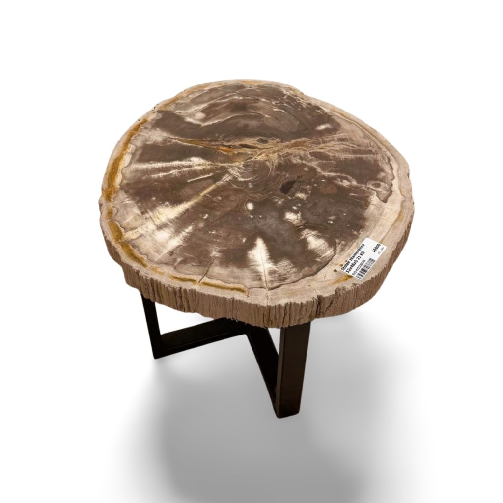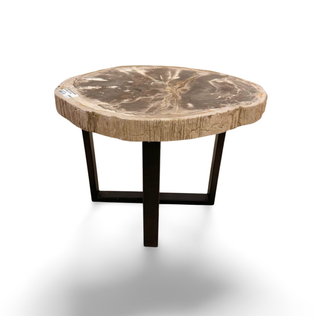 Masivní kamenná deska si zachovává přirozený tvar i surovou strukturu okraje, zatímco horní plocha je hladce leštěná a zvýrazňuje jedinečnou kresbu zkamenělého dřeva. Stabilní kovová podnož dodává stolku moderní kontrast a zajišťuje pevnost i dlouhou životnost.